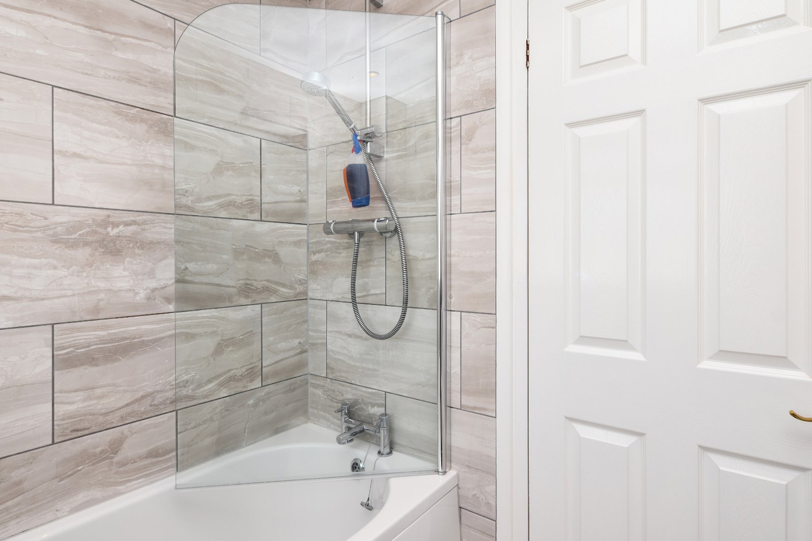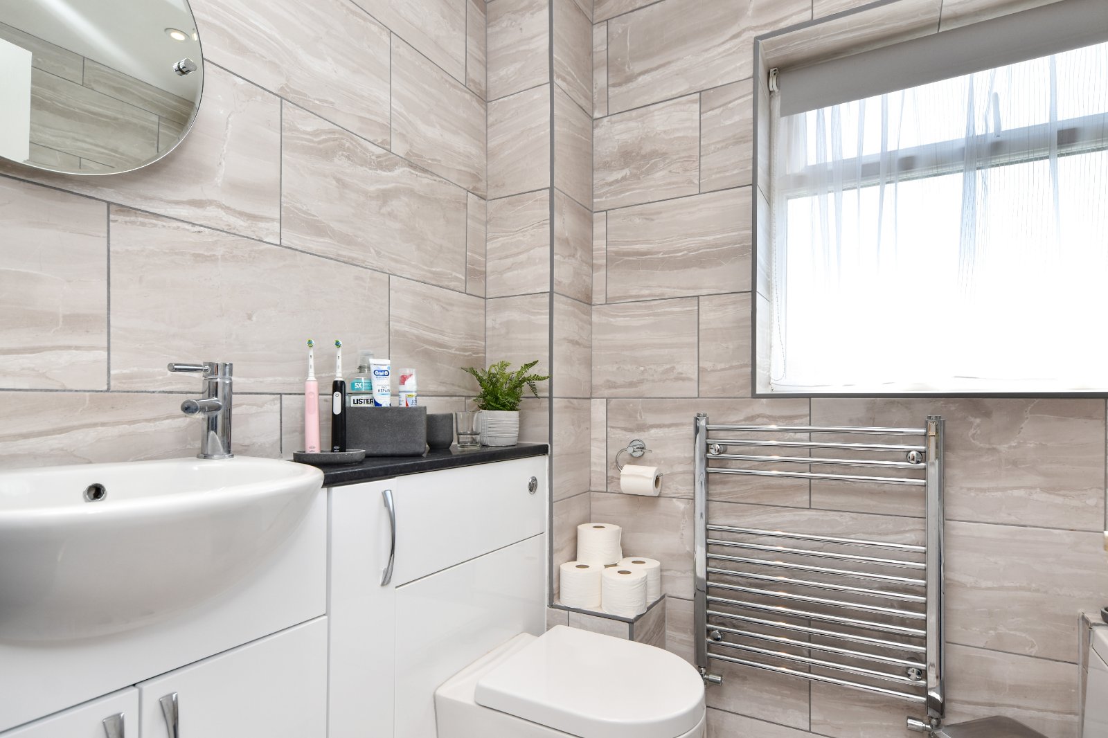 Obscure uPVC double glazed window to rear aspect. The modern three piece white suite comprises panelled enclosed bath with mixer tap and integrated shower unit and fitted shower screen, vanity unit inset with concealed cistern dual flush WC and vanity wash hand basin with mixer tap and storage cupboards under. Attractive tiling to all visible walls with matching floor tiling. Ladder style heated towel rail. Coving to textured ceiling.