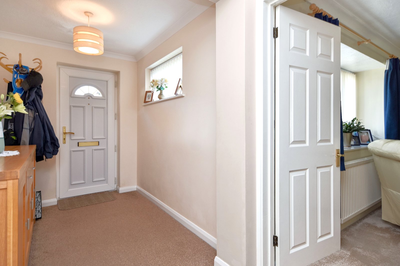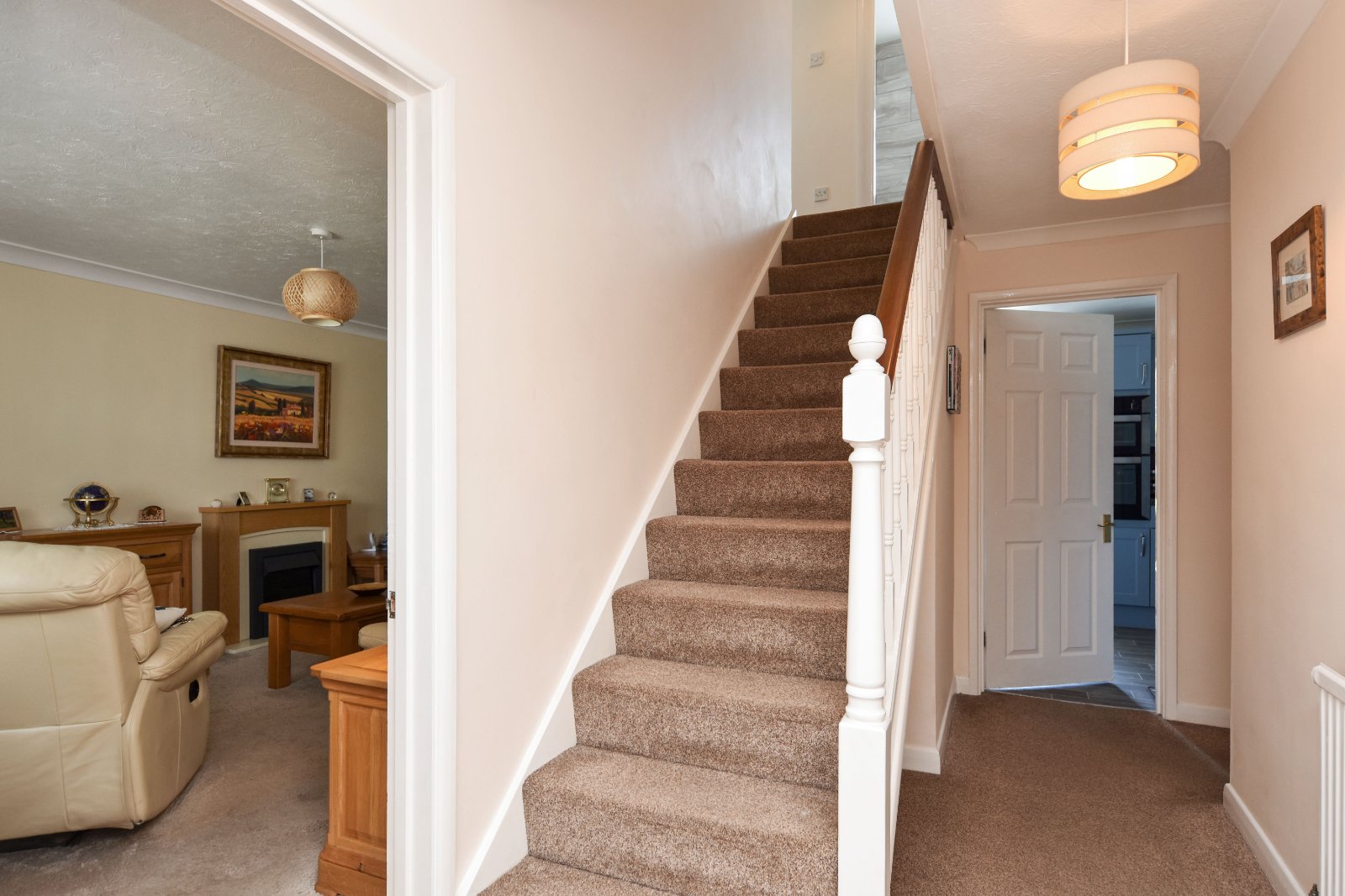 High level uPVC double glazed window to side aspect inset with vertical blinds (to remain). Radiator. Staircase providing access to first floor with spindle balustrade with recessed storage area beneath. Panelled doors to Kitchen, Living Room and Ground Floor Guest WC. Coving to textured ceiling. Further Door to;