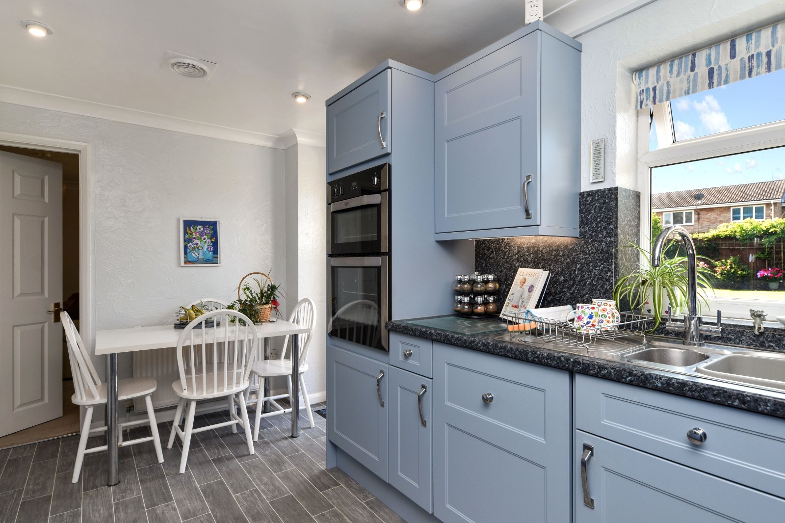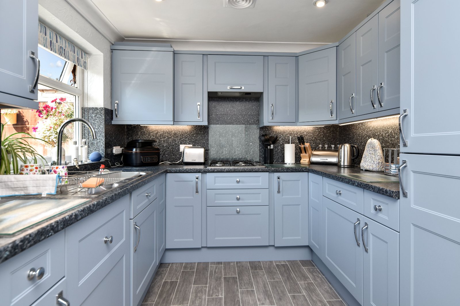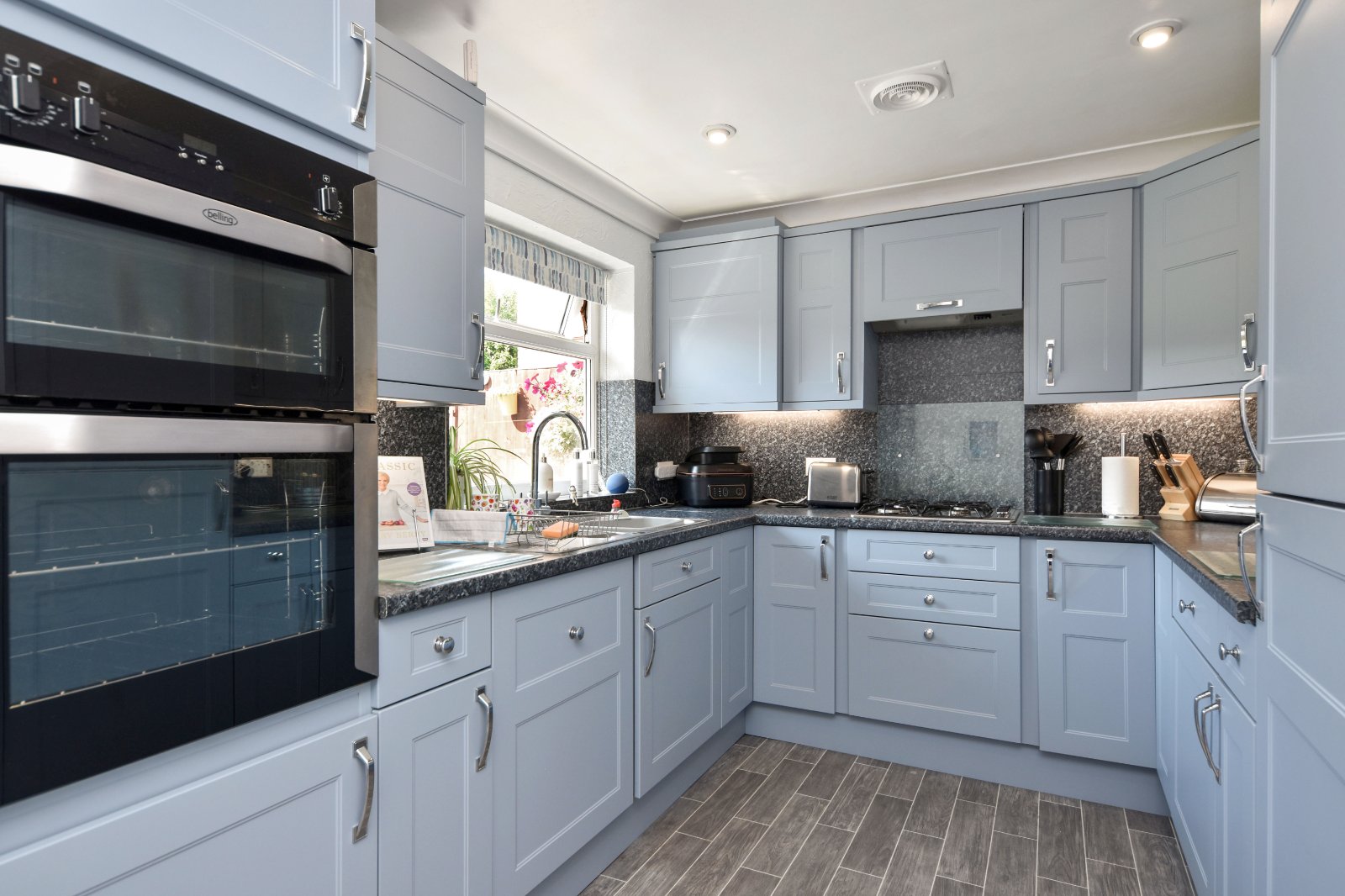 uPVC double glazed window to rear aspect inset with roller blinds (to remain). Obscure uPVC double glazed door opening to the rear Garden. The Kitchen is fitted with a range of shaker style units in an attractive 'Indigo Blue' cabinets with rolled edge working surfaces over inset with one-and-a-quarter single drainer sink unit with mixer tap over. Pair of eye level 'Belling' ovens with split level 'Belling' four ring gas hob with concealed extractor canopy over. Integrated upright fridge/freezer and undercounter dishwasher. Splashbacks in matching laminate to worktops. Under unit lighting, Panelled door to recessed storage cupboard. Radiator. Coving to textured ceiling inset with recessed lighting.