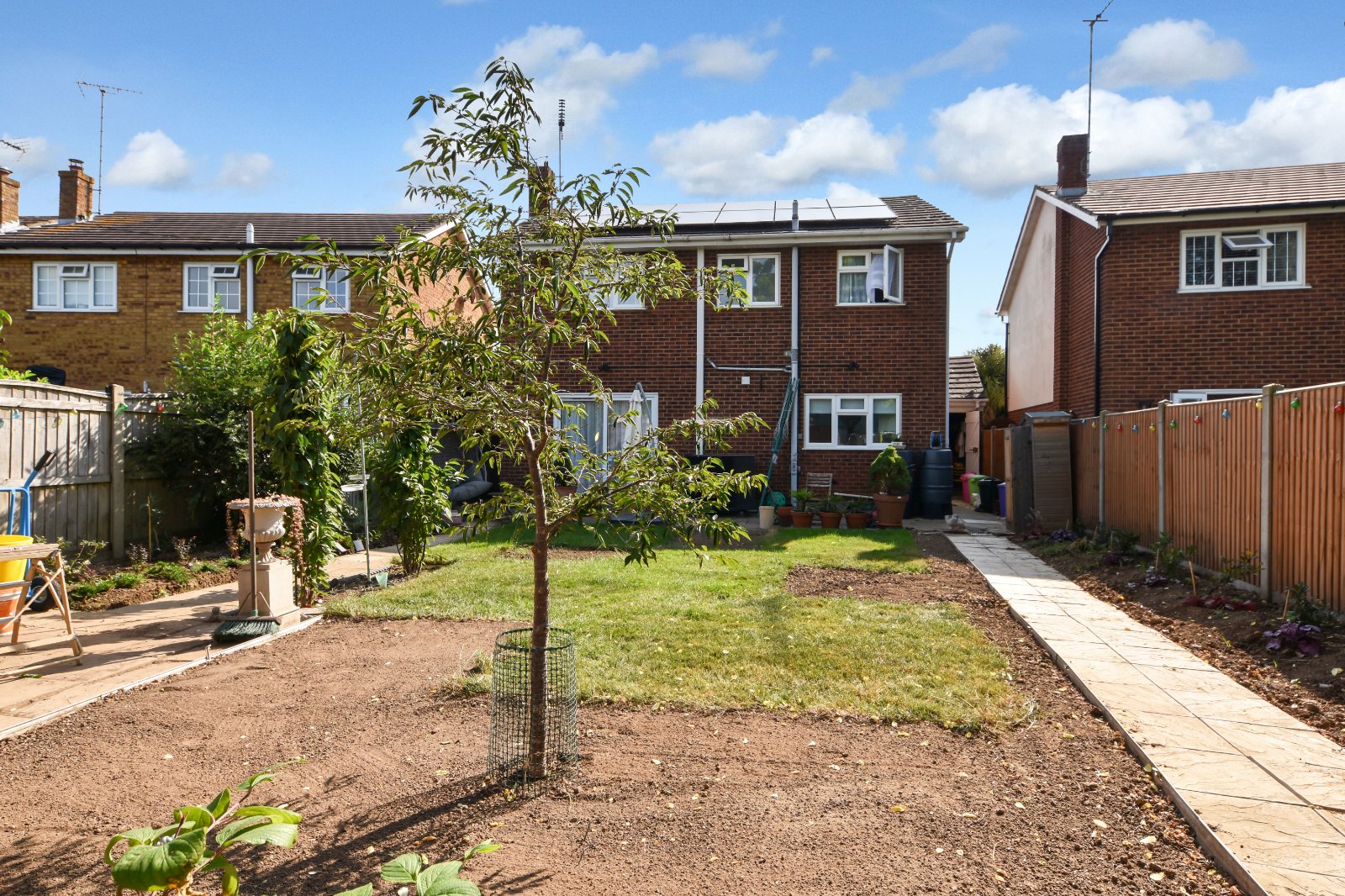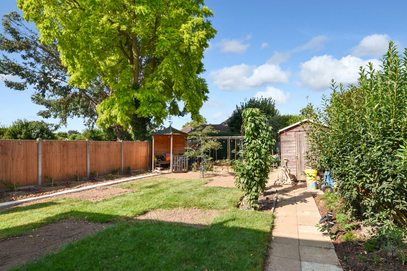 The generous sized West facing rear Garden is approached via the sideway access from Kitchen and directly from the Living Room to a paved patio seating area which opens to the lawn with flower bed border and raised planters. Attractive shaped wooden seating area and a vegetable garden set to the rear. Shed, sideway with a side gate, rear personal door to the garage, outside tap and Lighting.