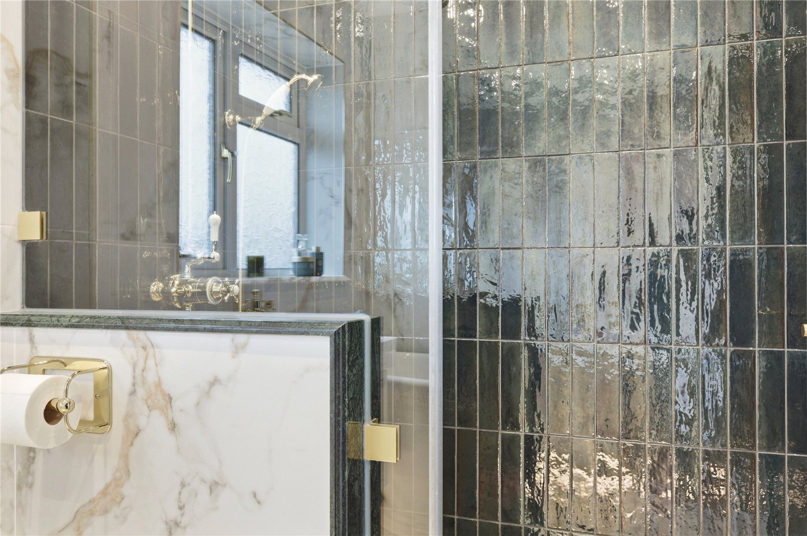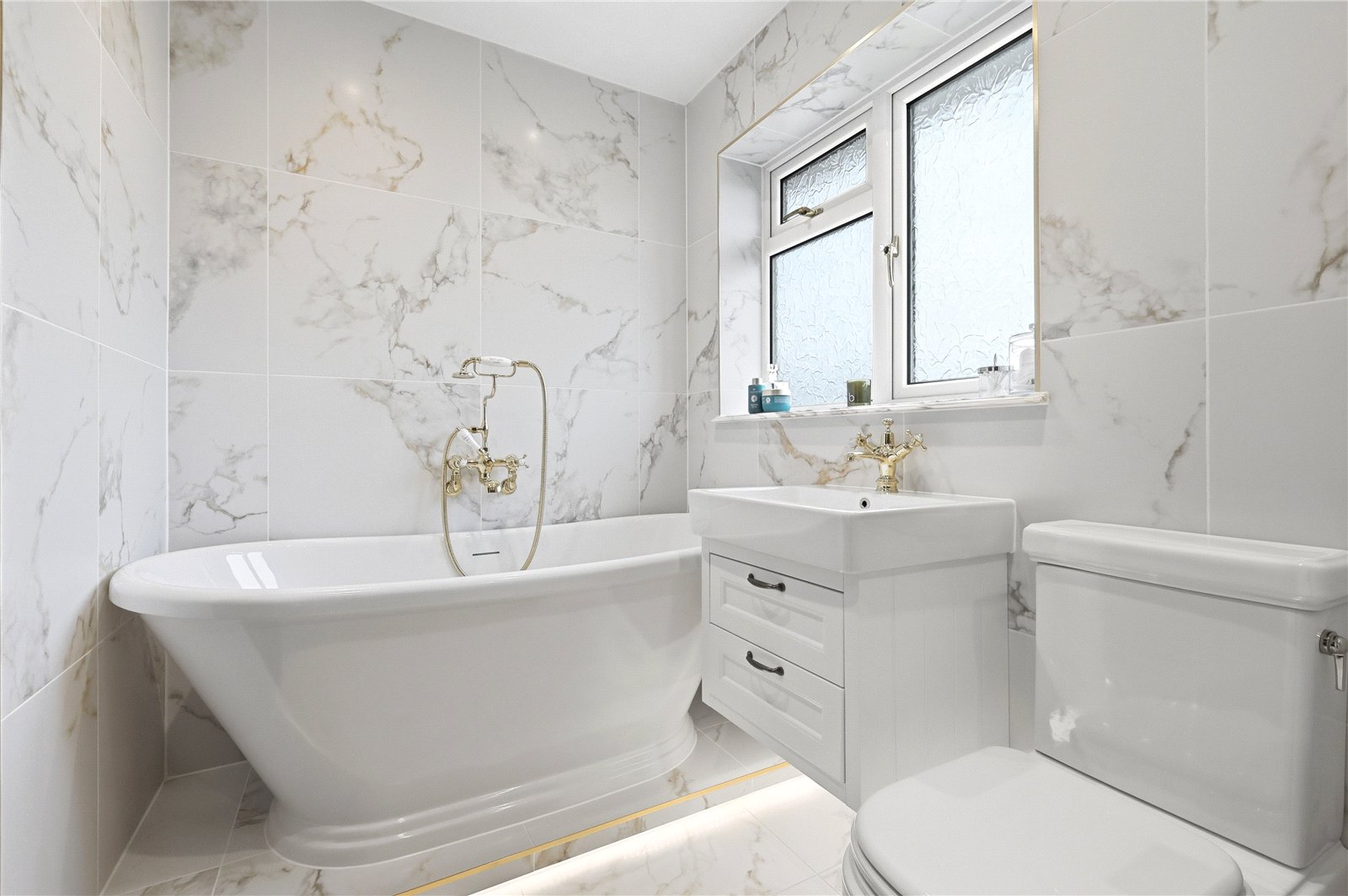 UPVC double obscured glazed window to rear. Fitted with a luxurious four piece suite comprising Burlington low flush WC with matching wall mounted wash basin with mixer tap storage drawers beneath. Free standing rolled top bath with wall mounted Burlington mixer tap with detachable showerhead and walk in enclosed shower with wall mounted Burlington mixer, rainfall showerhead plus detachable showerhead. Luxury tiled shower enclosure with glass shower screen and door. Marble window sill and marble waterfall pieces for glass shower screen enclosure. Porcelain tiled floors and walls with underfloor heating. Heated towel rail. Smooth plastered ceiling with recessed LED lighting.