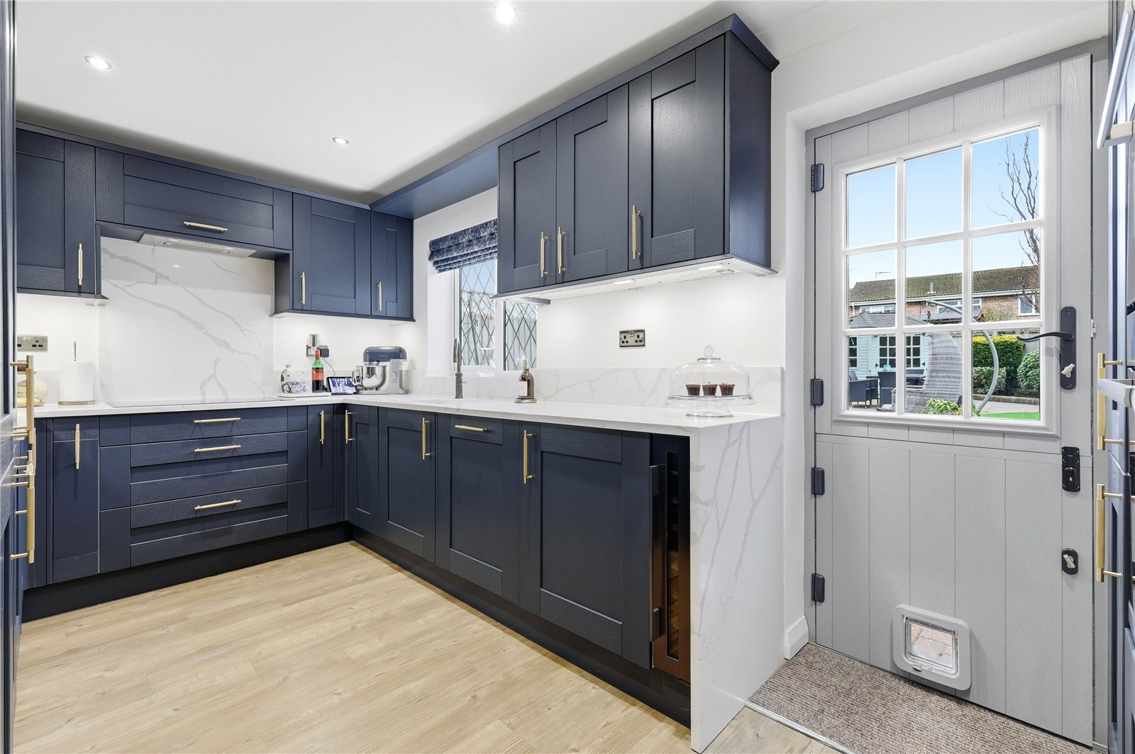 Composite stable style door to rear with inset glazed panels leading to rear garden with UPVC double glazed leaded light window to rear. Kitchen is fitted with a high end range of base and eye level shaker style cabinets incorporating a waterfall Quartz working surface with matching splashback. Undermount one and half bowl Porcelain sink with Insinkerator food waste disposal unit. Grooved drainer unit and Quooker instant hot water tap including sparkling water attachment. Inset Bosch Series 8 Induction Range hob with recessed extractor hood above. Integrated Bosch double pyrolytic ovens with microwave oven and steamer oven above. Integrated wine cooler, dishwasher. Integrated full height refrigerator. Pull out pantry cupboard. Under cabinet accent lighting. Understairs storage cupboard to front. Wood effect Amtico flooring. Coved cornice to smooth plastered ceiling with recessed LED lighting. Door to side provides access to the: