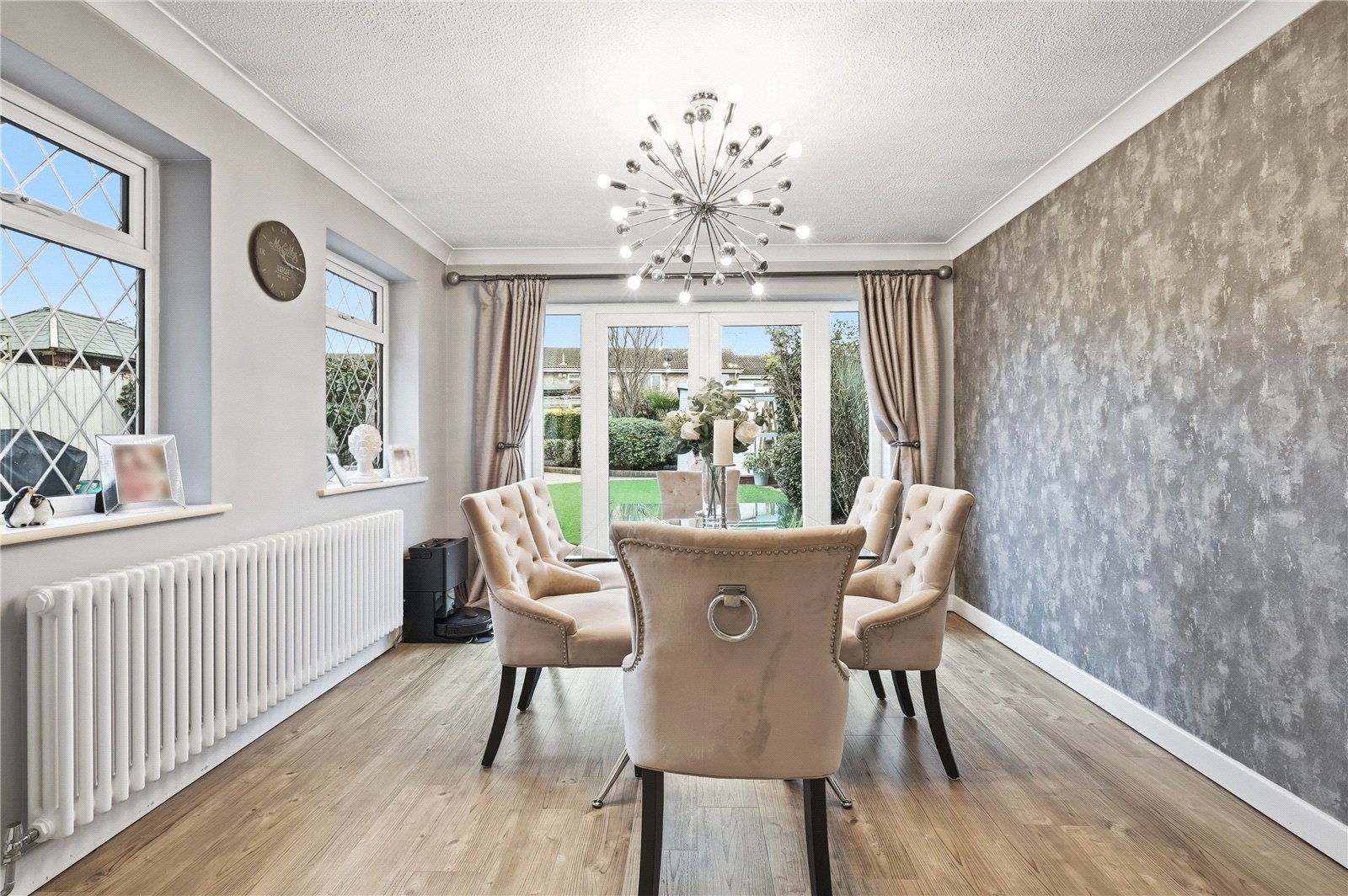 UPVC double glazed French doors to rear with full height double glazed windows adjacent provides access to the rear garden. Two UPVC double glazed leaded light windows to side. Wall mounted designer radiator. Wood effect Amtico flooring. High level skirting. Coved cornice to ceiling.