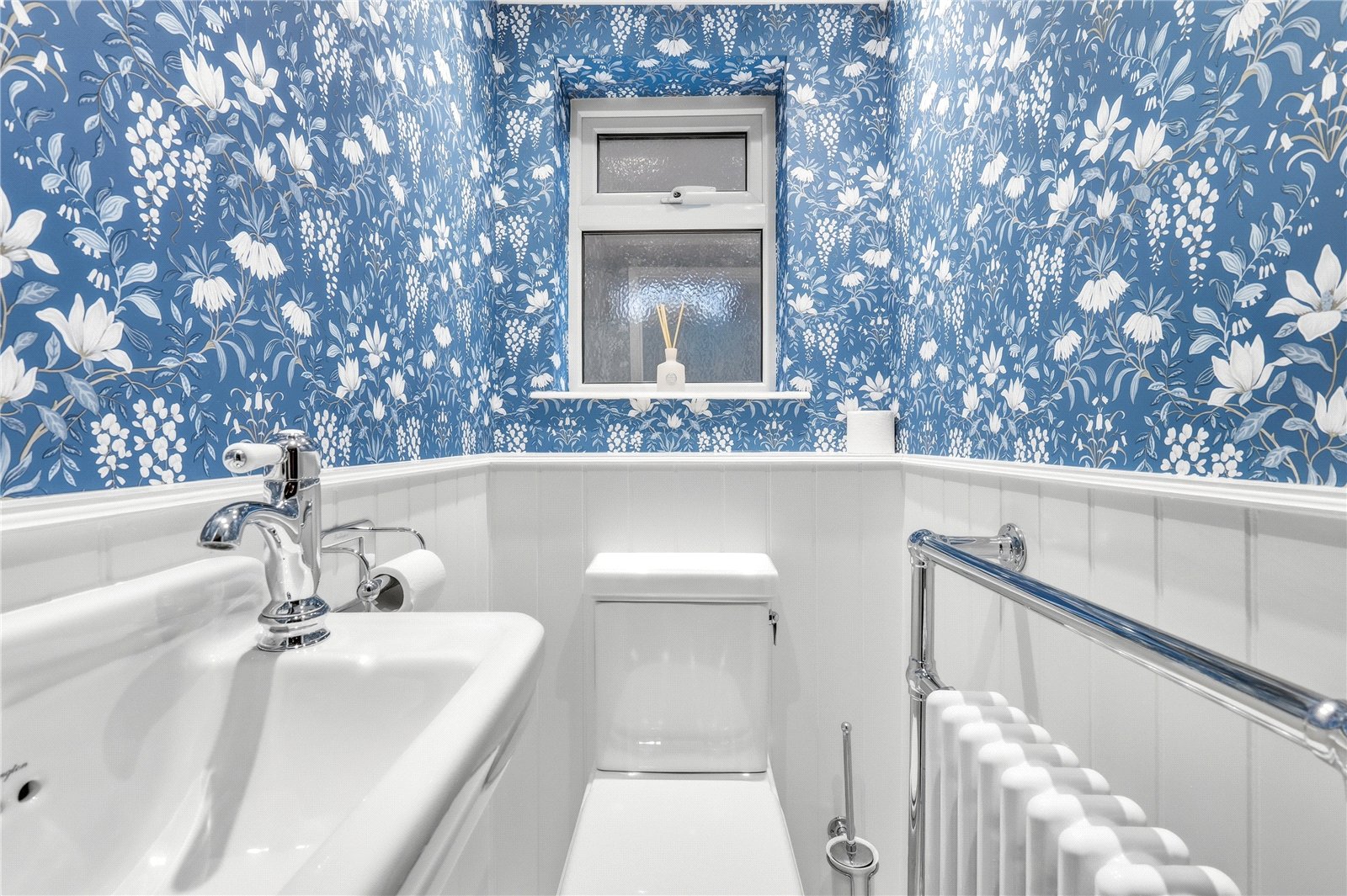 UPVC double obscured glazed window to side. Fitted with a beautiful two piece suite comprising Birlington low flush WC with matching wall mounted basin and mixer tap. Traditional heated towel rail. Marble style porcelain tiled floor. Marble window sill. Half height panelled walls. Coved cornice to smooth plastered ceiling with recessed LED lighting.