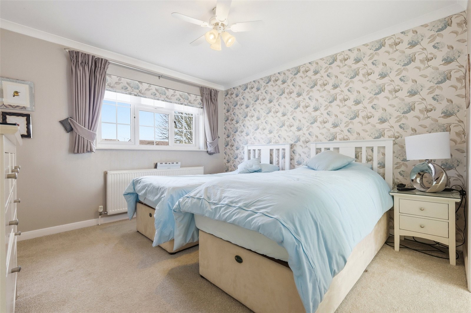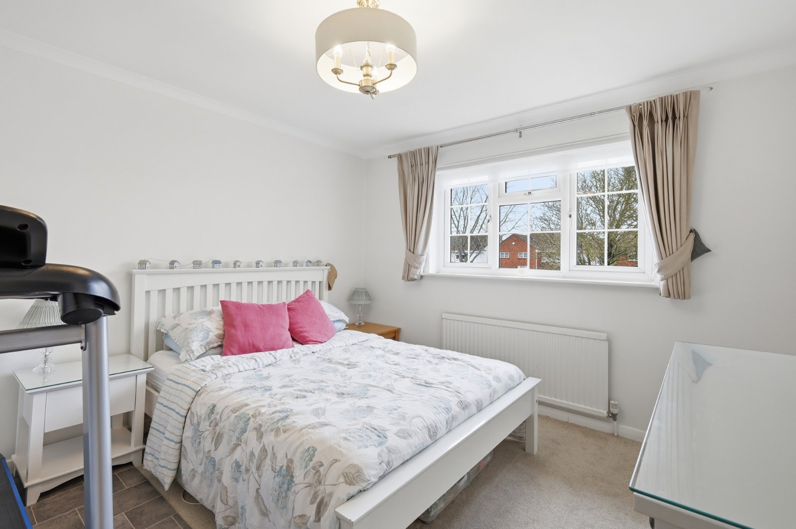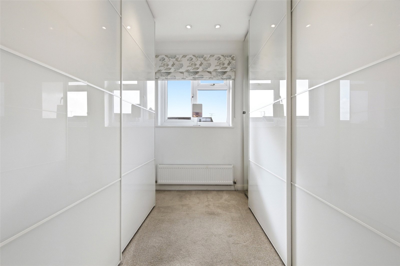 uPVC double glazed window to rear. Radiator. Fitted with a contemporary range of full height 'Sliderobe' wardrobe cupboards with hanging and shelved storage space. Coved cornice to smooth plastered ceiling with recessed directional LED lighting. Agent’s note: our clients converted the former fourth bedroom into the dressing room, however the fourth bedroom could easily be reinstated).