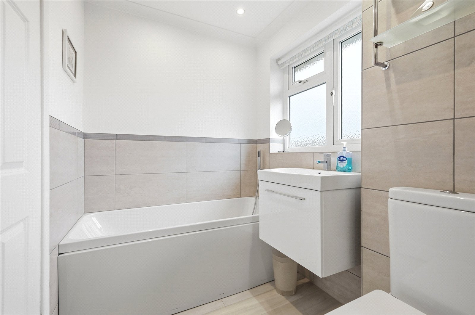 A beautifully re-fitted spa style bathroom with obscure uPVC double glazed window to rear. Fitted with a four piece suite comprising panel enclosed bath with designer mixer tap and shower attachment, vanity wash basin with designer mixer tap and gloss fronted storage cupboard beneath, dual-flush close coupled WC and frameless glass 'walk-in' shower enclosure with wet room style shower. Full height heated towel rail. Electric shaver point. Coved cornice to smooth plastered ceiling with recessed LED lighting. Extractor fan.