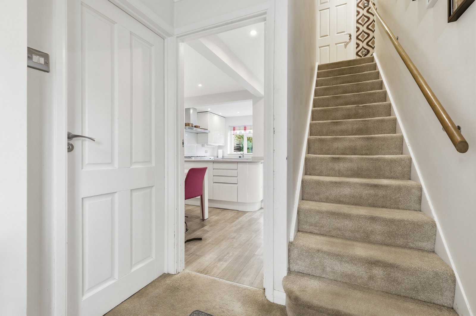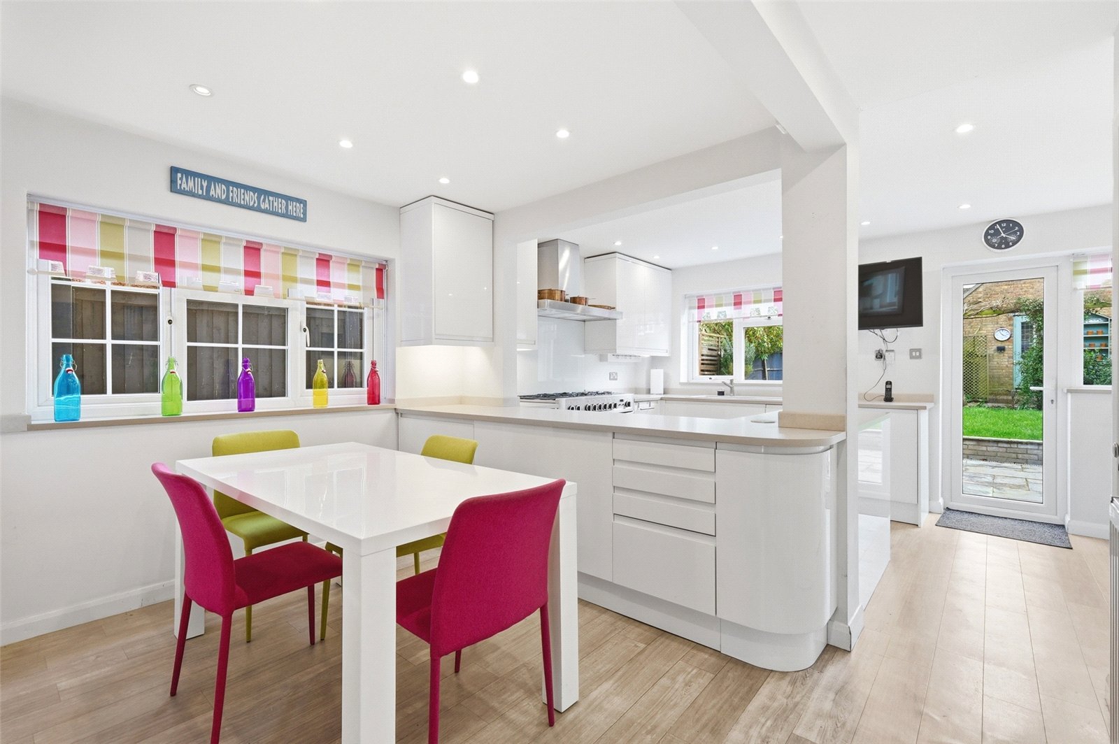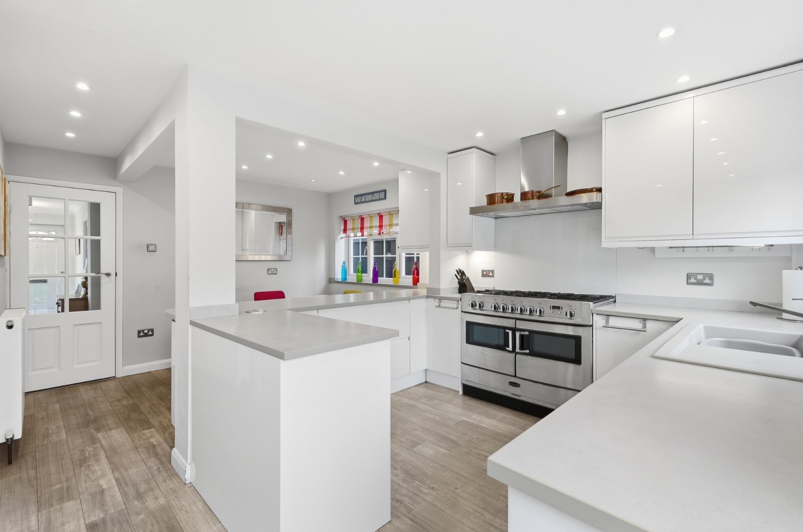 uPVC double glazed door leads onto the landscaped south facing rear garden, uPVC double glazed windows to side and rear. The kitchen has been professionally planned and fitted with a comprehensive range of base and pelmeted eye level cabinets in gloss fronted, frameless white units with squared edged quartz effect working surfaces and inset coloured enamel sink unit with designer mixer tap, additional utility/vegetable prep sink. Under unit lighting. Space and supply for double width stove with brushed steel designer extractor canopy with glass splashback above. Integrated housing for fridge/freezer. Space, plumbing and drainage for automatic washing machine and tumble dryer. Recess for microwave oven. Access to larder cupboard with courtesy light and shelving. Radiator, smooth plastered ceiling with recessed LED lighting.