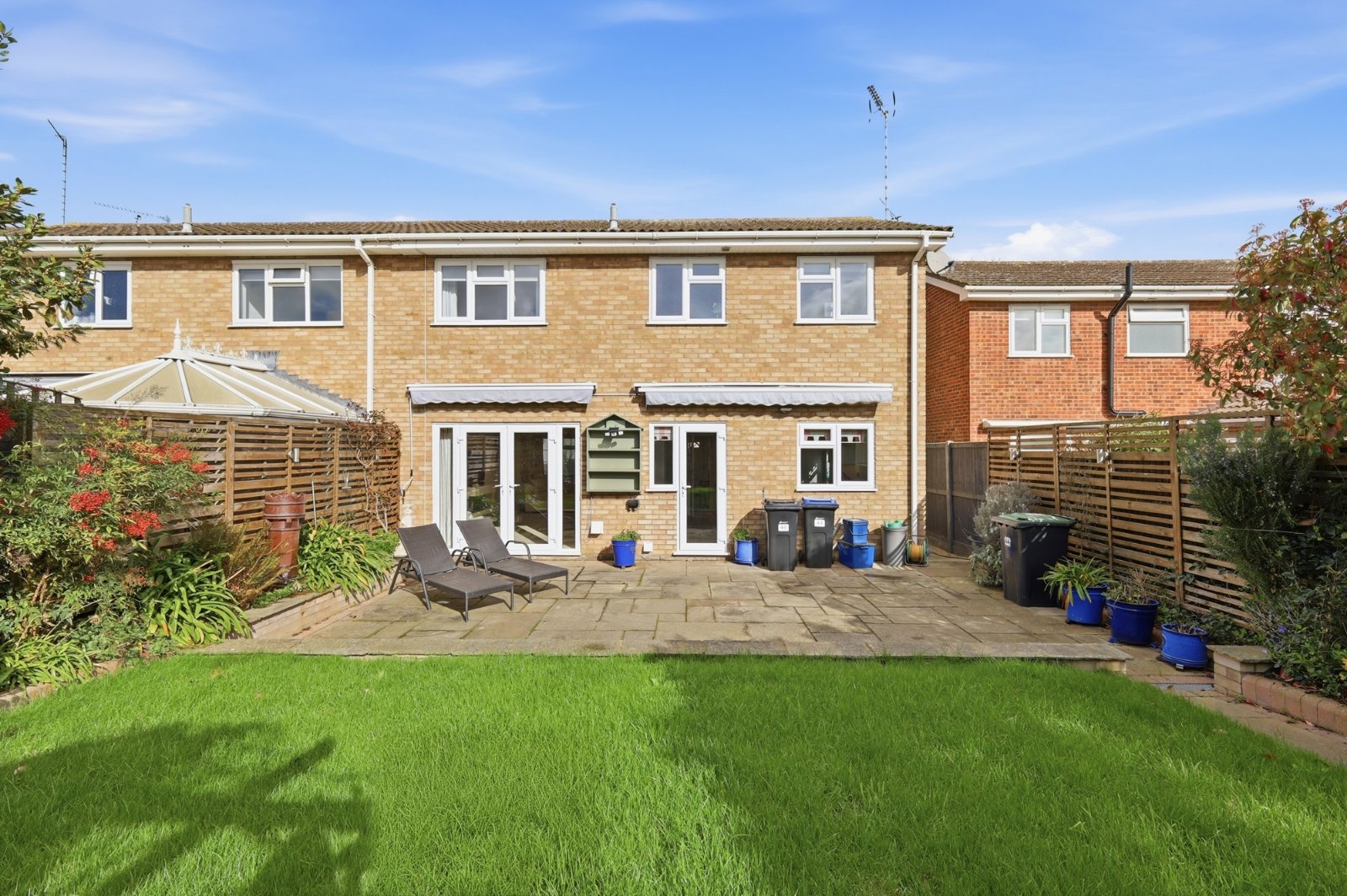 The rear garden commences from the kitchen/breakfast room and lounge/dining room with a full-width slate effect paved patio terrace, ideal for dining alfresco. Dwarf retaining wall with shaped planted side borders. Full height fencing to both sides and rear. Contemporary landscape fencing with lighting to both sides. A footpath leads to the rear of the garden where a pergola covered area leads into the garage and garden storage shed. Personal door to garage. Multiple external power points, and secure gated side access to the front of the property. External water supply.