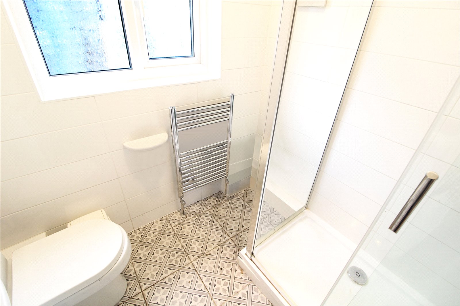 Floor to ceiling tiled walls, lino to floor, double glazed obscure window to front, smooth ceiling, ceiling light, shower, sink, WC, Towel rail, vanity unit and storage cupboard.