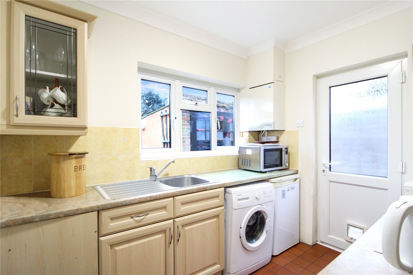 Fitted kitchen with eye and base level units, tiled floor, tiled splashbacks, built in electric oven and gas hob, space for washing machine, space for fridge, double glazed window to rear aspect, obscure double glazed door to rear garden via side access, smooth ceiling, ceiling light, radiator.