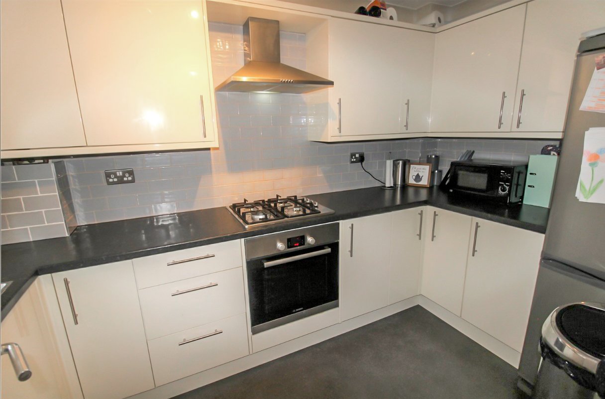 UPVC double glazed window to front. The kitchen has been professionally planned and fitted with a comprehensive range of base and pelmetted eye level cabinets in gloss-fronted cream, with contrasting gloss metro tiled splashbacks and granite-effect working surface with inset stainless steel sink unit and mixer tap. The integrated appliances include split-level fan-assisted electric oven in brushed steel with four-ring gas hob, and brushed steel extractor canopy above. Space for upright fridge/freezer. Space, plumbing and drainage for automatic washing machine. Corner extra space units. Access to cupboard housing boiler serving domestic hot water and central heating system. Radiator. Coved cornice to ceiling.