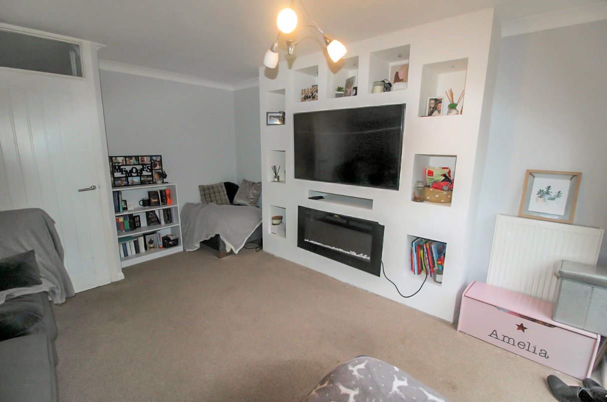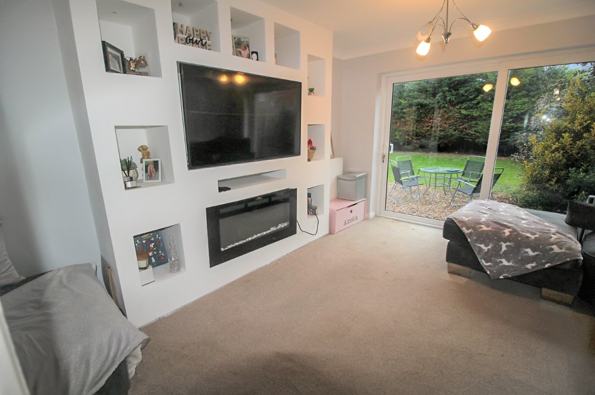 UPVC double glazed patio doors lead onto the double-width screened and landscaped garden. Two radiators. Entertainment wall featuring inset ribbon-effect electric fire, with recess for flat screen television and LED-lit display niches. Coved cornice to smooth plastered ceiling.