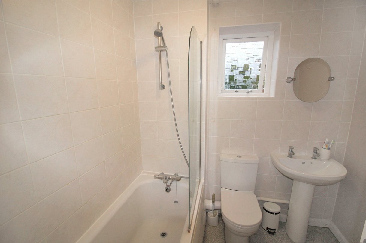 Obscure glazed window to side. Fitted with a three-piece suite comprising panel-enclosed bath with frameless glass shower screen and mixer tap with shower attachment, dual flush close coupled WC, and pedestal wash handbasin. Radiator. Drop light switch.