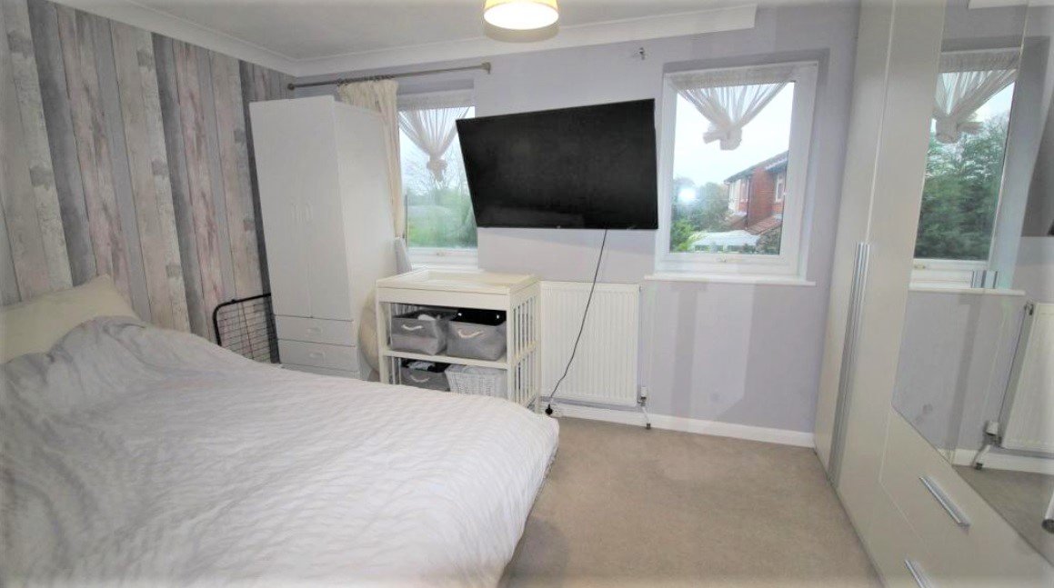 Twin UPVC double-glazed windows to front. Radiator. Access to built-in overstairs storage cupboard/wardrobe. Coved cornice to ceiling.