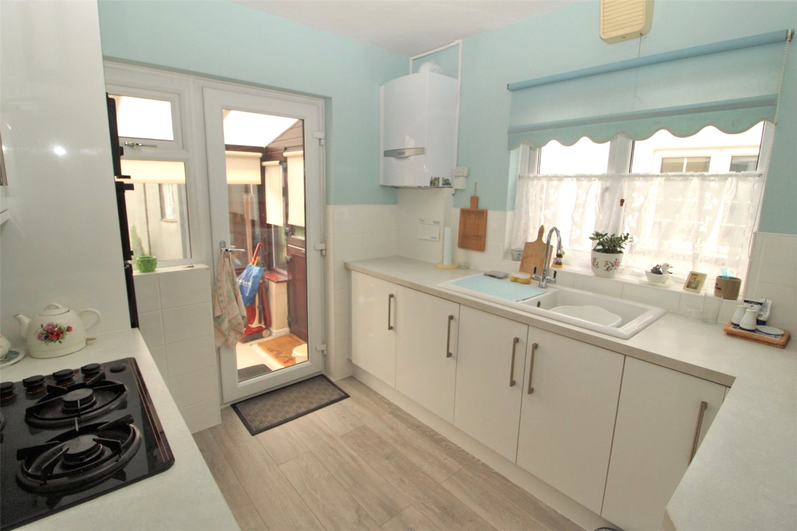 Double glazed windows to side and rear aspect, double glazed door to rear aspect leading out to the conservatory. Kitchen comprising of a range of squared edge worktops with inset ceramic single bowl sink unit with drainer and hot and cold mixer tap, inset four ring gas hob. White gloss base cupboard and drawer units under and matching wall units over, fitted double oven, modern light grey wood effect vinyl flooring. Wall mounted boiler.