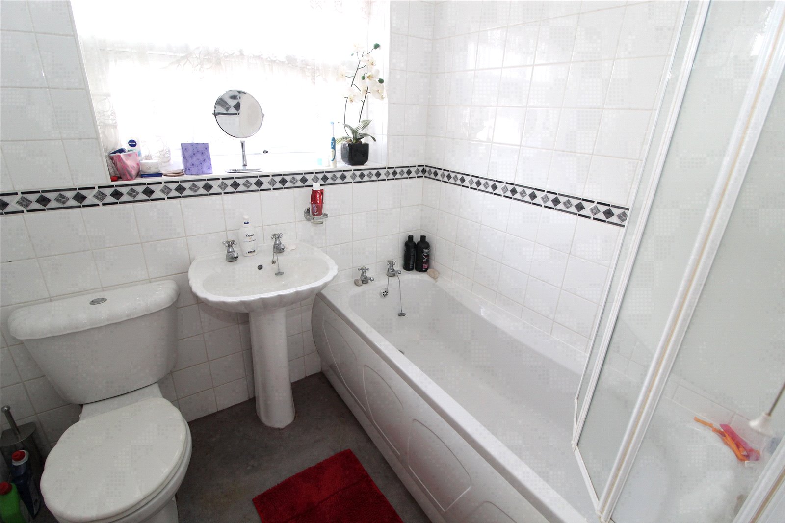 Fitted with three piece white suite comprising panelled bath with separate shower over and screen. Pedestal wash hand basin and low flush wc., Radiator. Fully tiled walls. Textured ceiling. Extractor fan. Double glazed obscure window to rear.