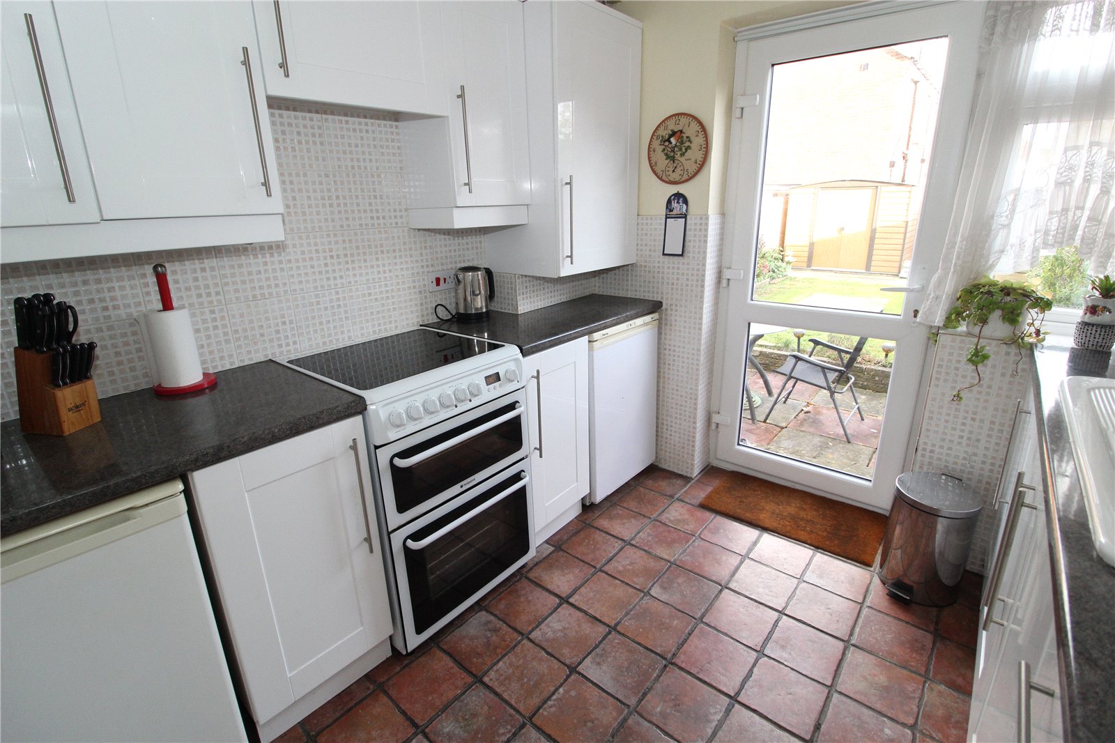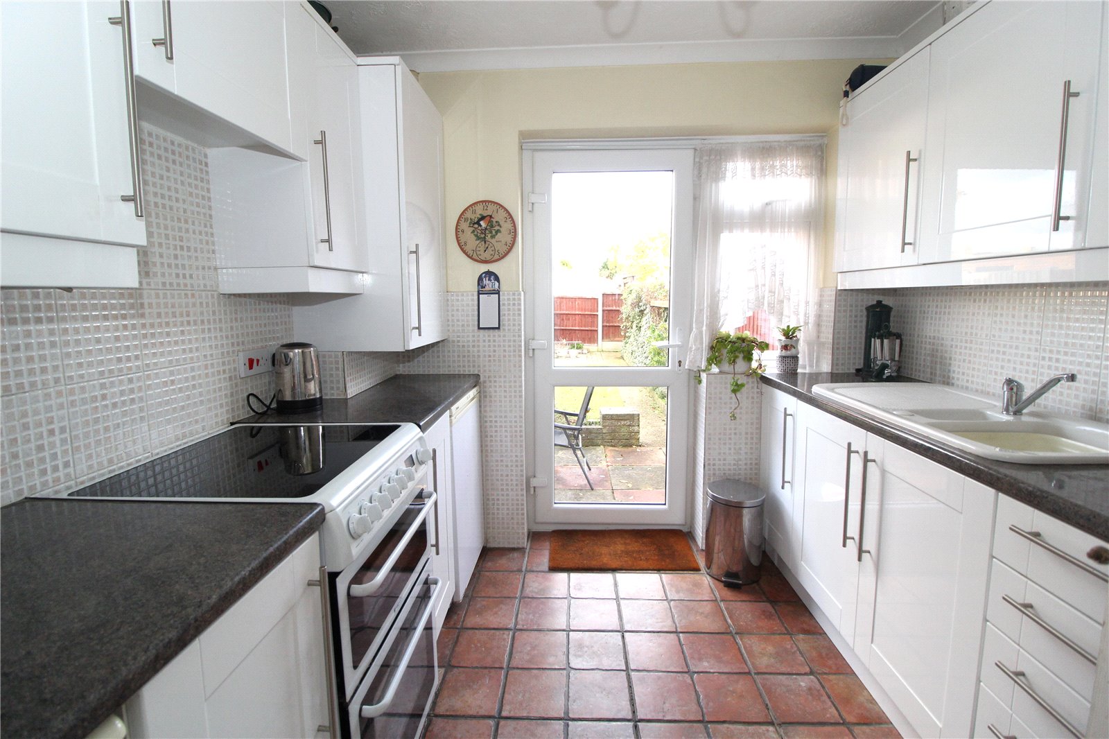 Fitted with modern white units comprising bowl and half sink unit with mixer taps set within roll edge work surfaces with base cupboards and drawers under and matching level cabinets above. Recess for cooker. Space and plumbing for washing machine. Space for under unit fridge and freezer. Cupboard housing wall mounted boiler serving gas central heating and domestic hot water. Tiling to working surface areas. Tiled floor. Textured ceiling with coving. Full glazed Upvc door to rear with window adjacent.