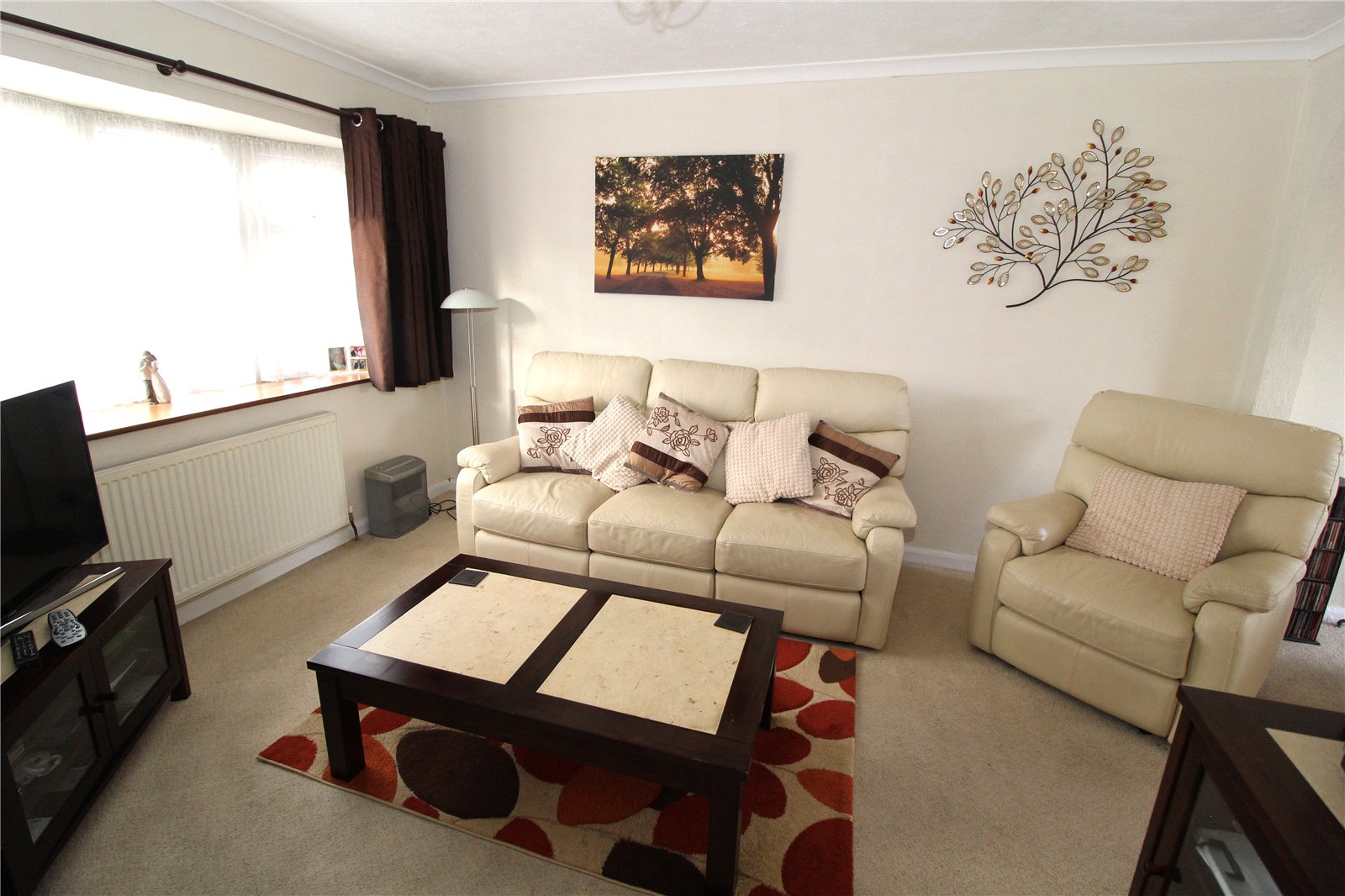 Lounge Area: Upvc double glazed bow window to front, radiator under. TV aerial point. Textured ceiling with coving. Archway to