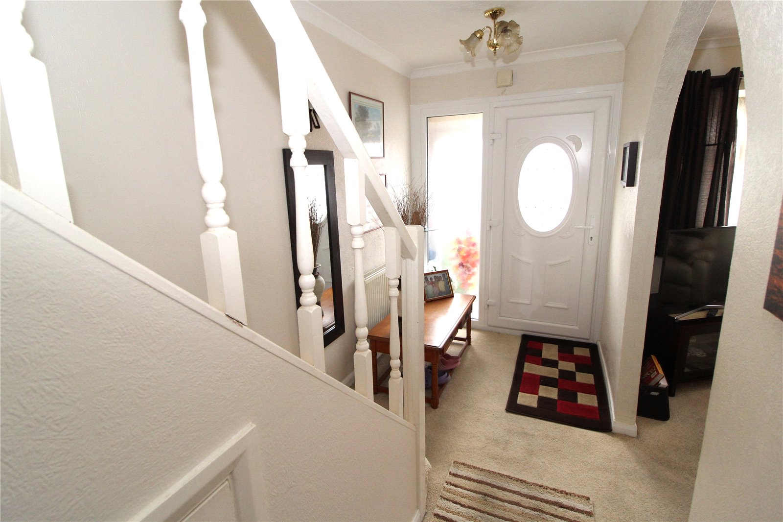 Staircase to first floor and landing with understairs storage cupboard housing meters. Radiator. Telephone point. Textured ceiling with coving. Panelled door to Kitchen and archway to