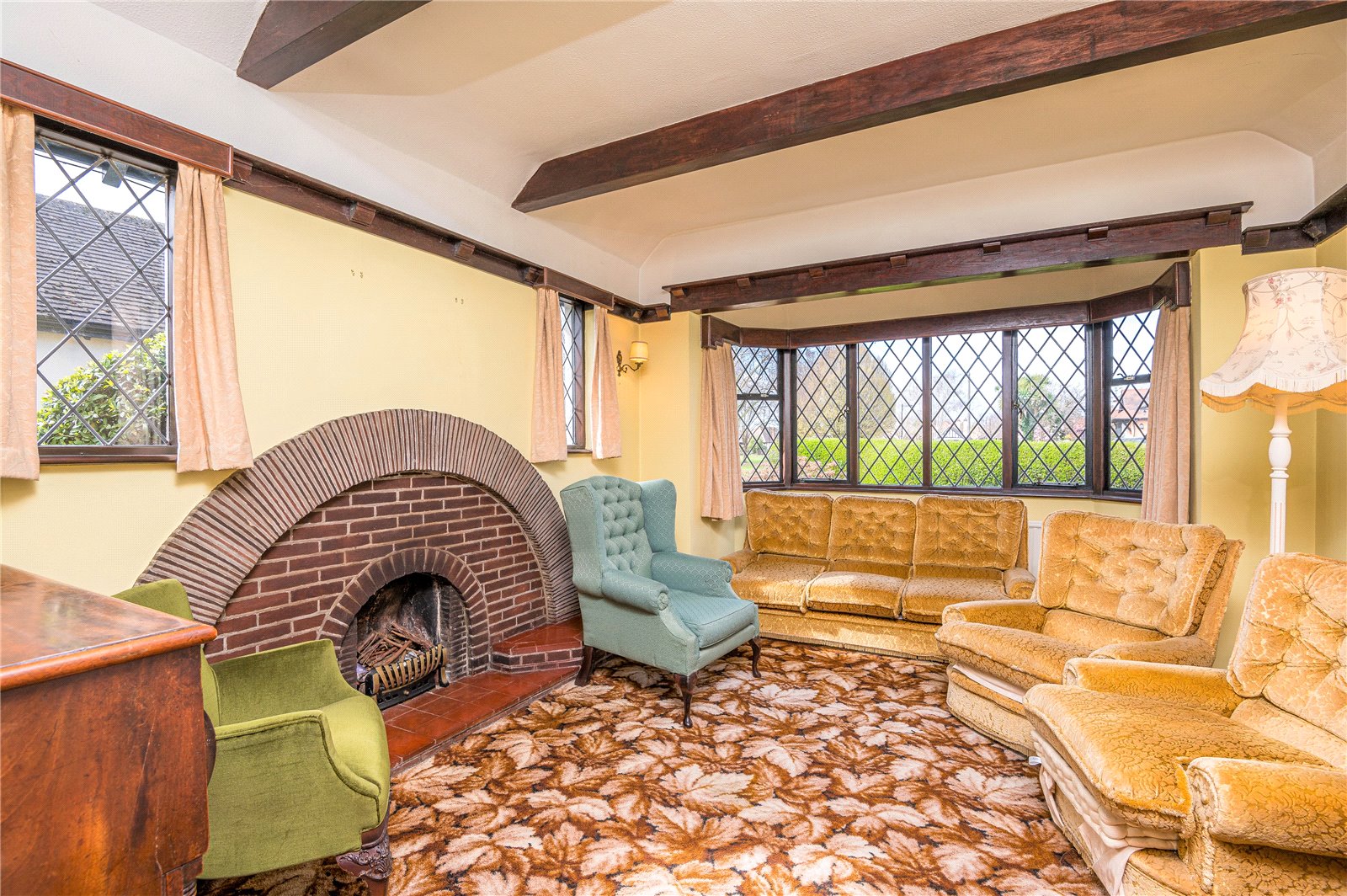 Approached via leaded light glazed double doors from the Entrance Hall. This bright and beautifully proportioned living room enjoys a dual aspect with windows to side and wide bay window to front framing lovely views across Branscombe Square gardens. Attractive arched red brick fireplace with open grate, tiled hearth. Two radiators. Beamed ceiling. Delph shelf.