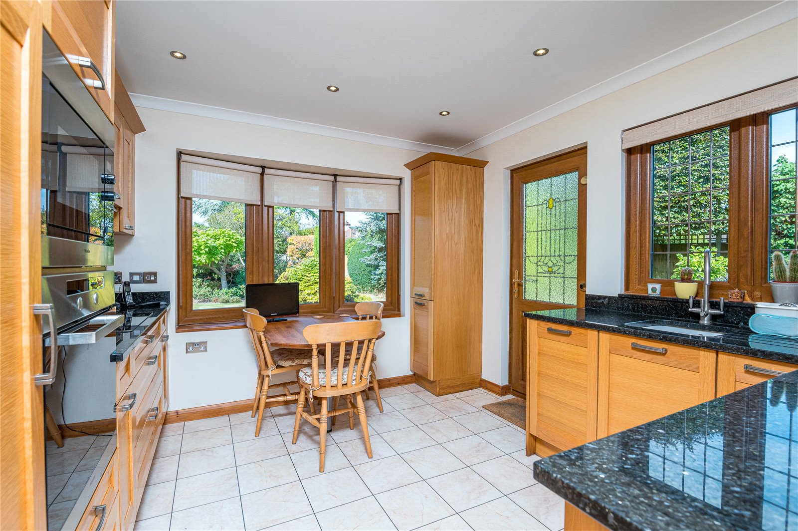 Fitted with an excellent range of natural wood fronted units and granite work surfaces with inset sink with mixer tap. Range of cupboards and drawers below. Built in "Miele" dishwasher with matching decor panel. Built in "AEG" washing machine with matching decor panel. Further granite working surfaces with inset "Miele" induction hob with "Miele" extractor hood, saucepan drawers below. Oven housing with built in stainless steel "Miele" oven and microwave with cupboards above and below. Built in refrigerator with matching decor panel. Matching range of wall mounted storage cabinets with lighting below. Tiled floor. Coved ceiling with recessed lighting. Built in breakfast table. This room enjoys a dual aspect with double glazed door and window to side plus double glazed Oriel bay window framing lovely views across the rear garden.