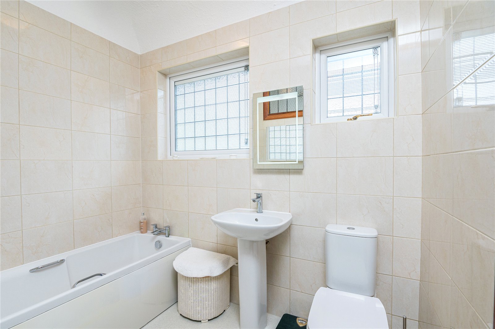 Fitted with a modern white suite comprising panelled bath with hand grips, mixer tap, pop up waste. Pedestal wash basin with pop up waste, mixer tap. Low flush WC. Fully tiled walls. Radiator. Two double glazed windows to side with integrated blinds. Further door leading to the entrance hall.