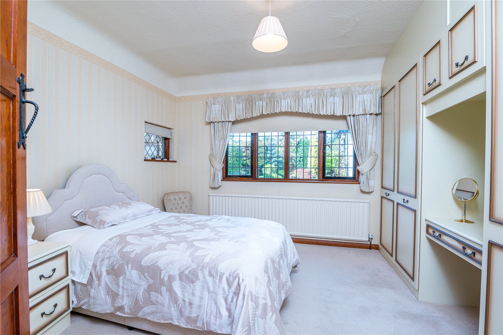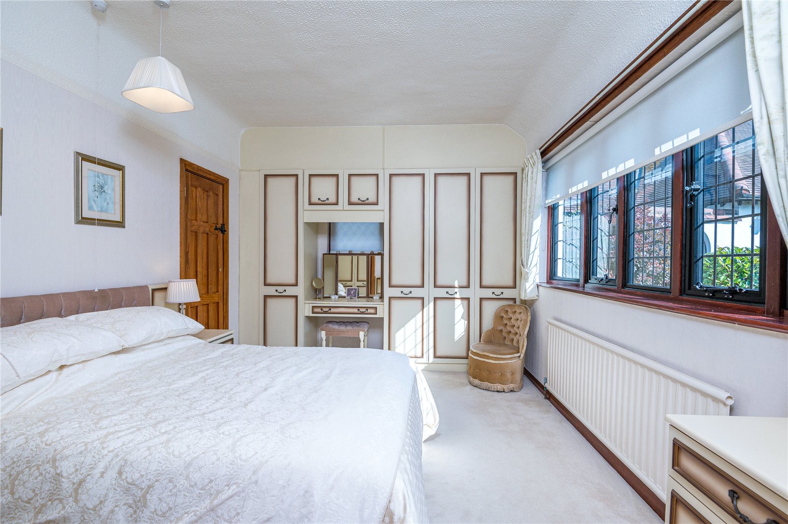 plus full width range of built in wardrobe cupboards and dressing table unit. This bright and spacious double bedroom has a wide double glazed Oriel bay window to front, affording lovely views across Branscombe Square Gardens. Radiator. Matching dressing table unit and bedside cabinets. Further double glazed window to side. Door to: