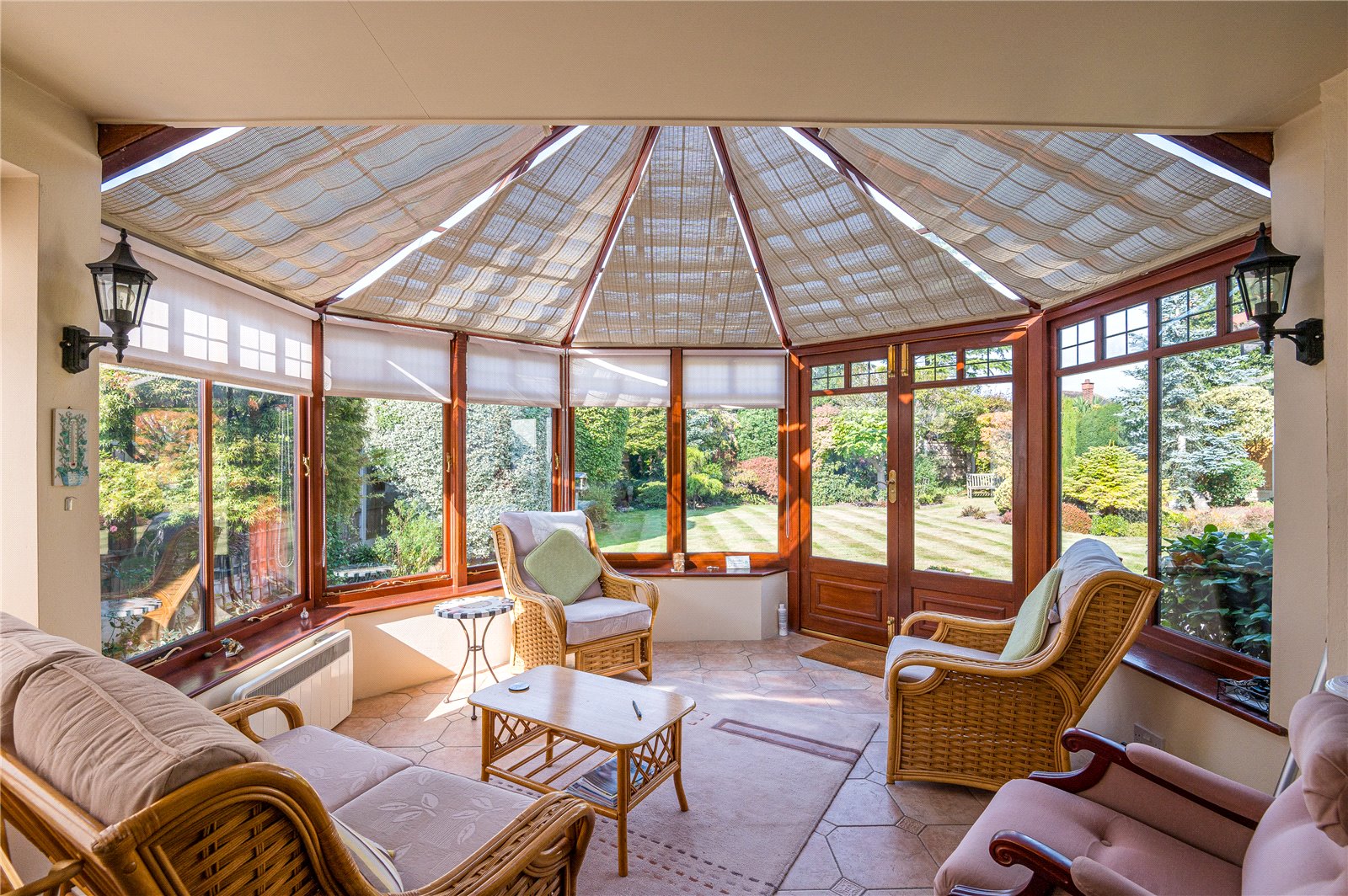 Double glazed hardwood conservatory with glazed vaulted ceiling. (Built by "Amdega". Full width windows and French double doors framing lovely views across the rear garden. Attractive tiled floor. Light and power.