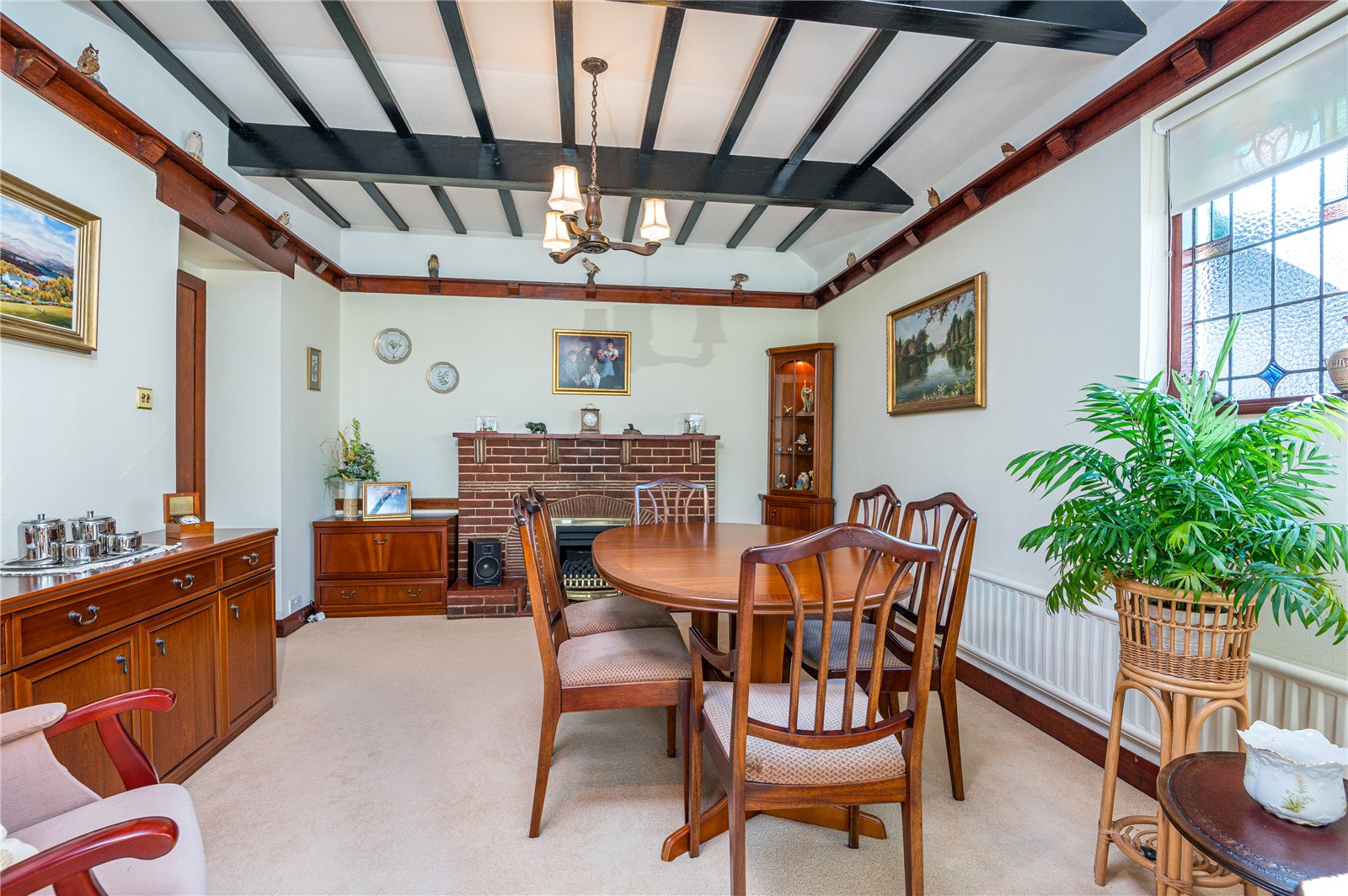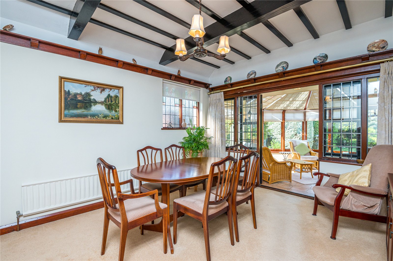 This good size formal dining room has an attractive original red brick fireplace with open grate, tiled hearth, fitted gas fire/Baxi Bermuda back boiler. Beamed ceiling. Delft shelf. Radiator. Pretty stained glass leaded light window to side. Full width leaded light windows and French double doors leading into conservatory and garden.
