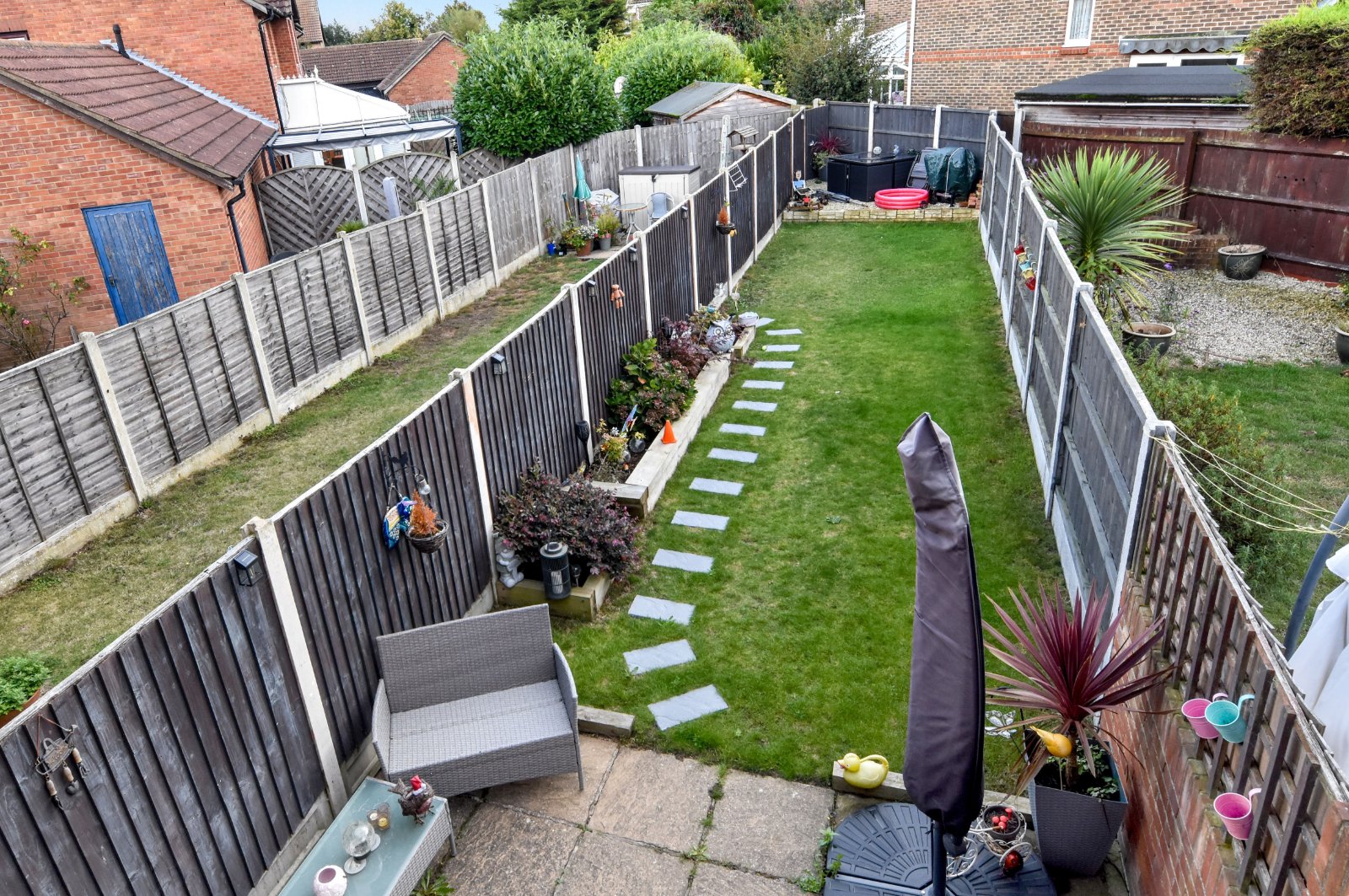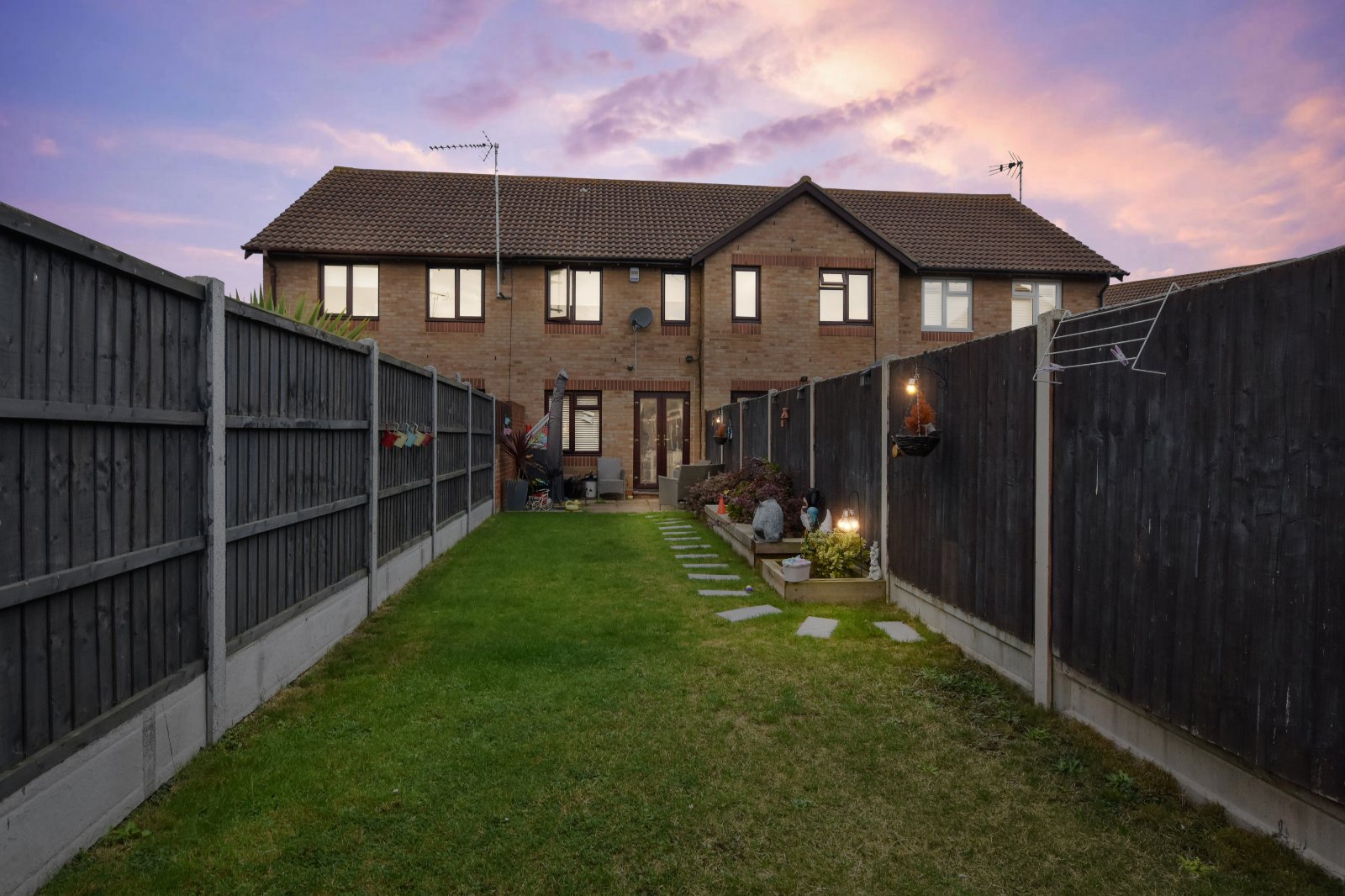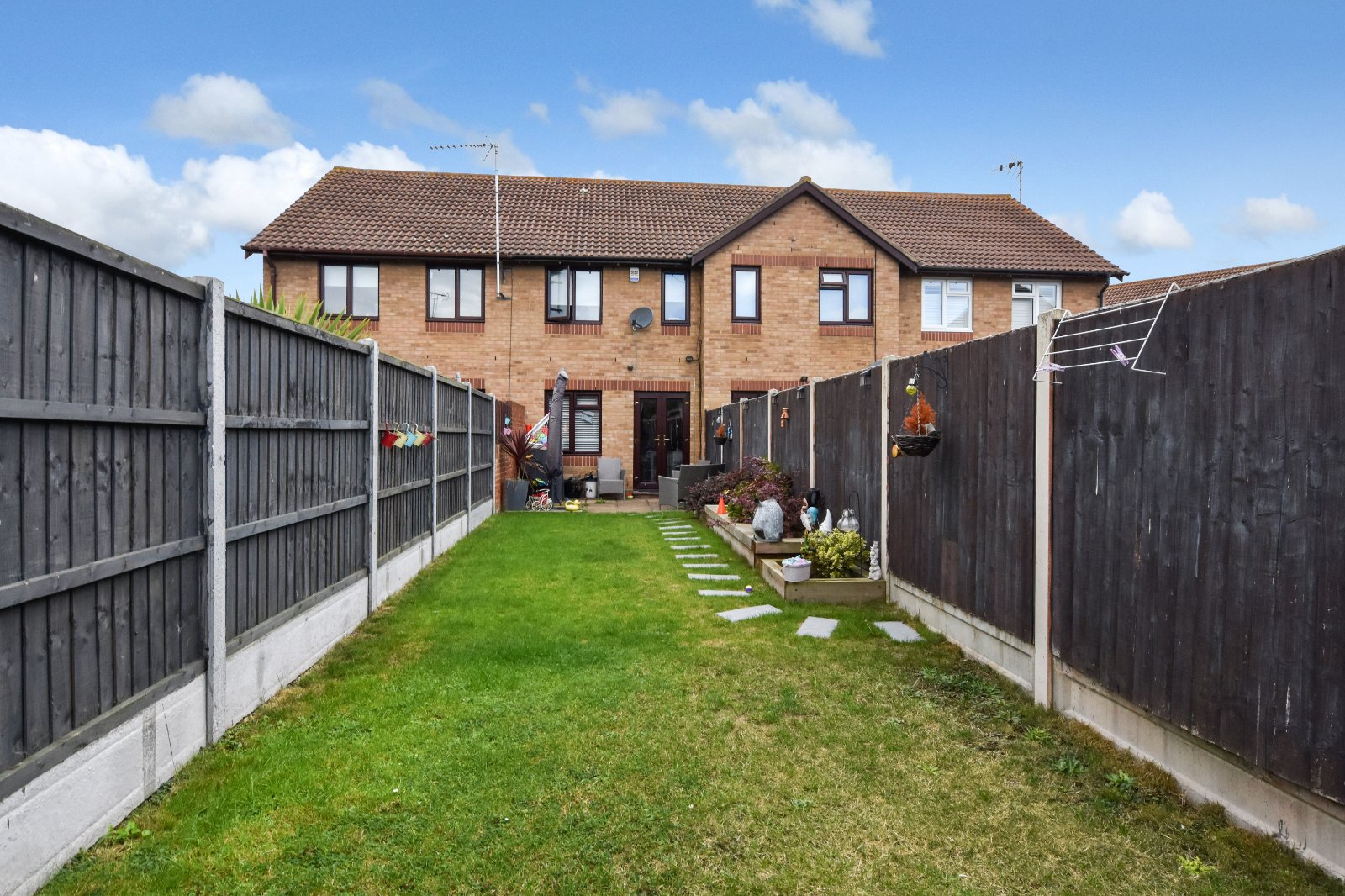 The rear garden is approached via the Living Room and commences with a flagstone patio seating area. The garden is mainly laid to lawn with part raised 'sleeper' enclosed flower bed borders. To the rear of the garden there is a part raised shingle patio area. External lighting. Fencing to boundaries.