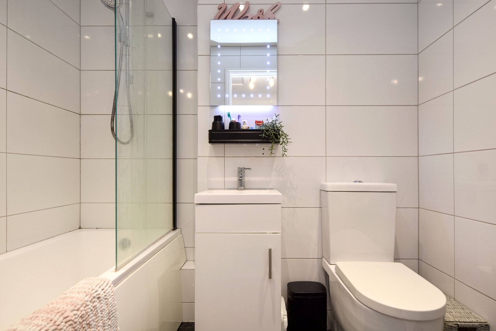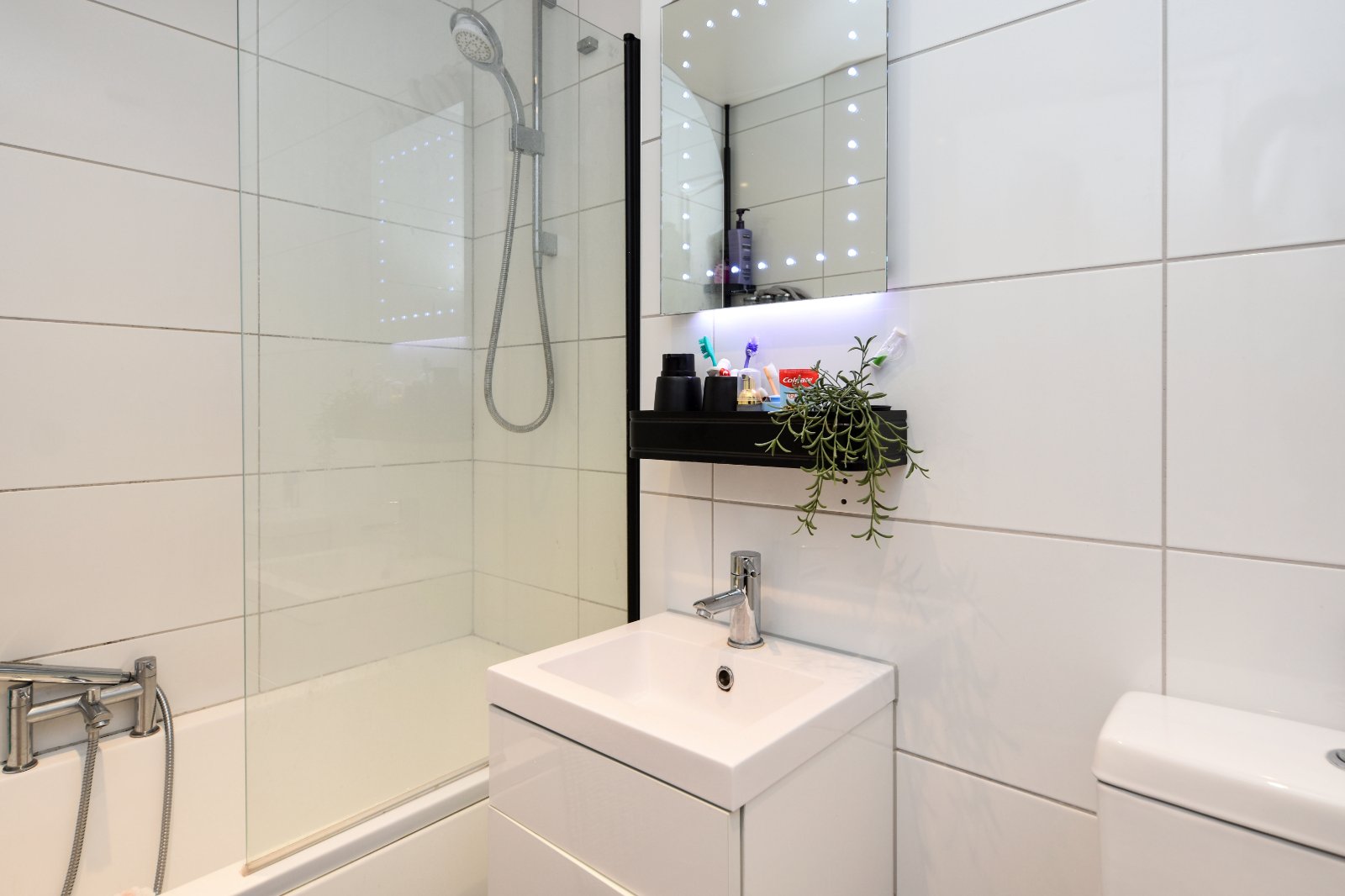 A modern white three piece suite comprises panelled enclosed bath with central control mixer tap over with shower attachment. Integrated shower unit over with fitted shower screen, vanity wash hand basin with mixer tap over and storage cupboard under with wall mounted 'LED' lit mirror over and dual flush wc, Attractive contemporary tiling to all visible walls. Ceramic black 'sparkle fleck' floor tiling. Ladder style heated towel rail. Smooth plastered ceiling inset with recessed lighting and ceiling mounted extractor fan.