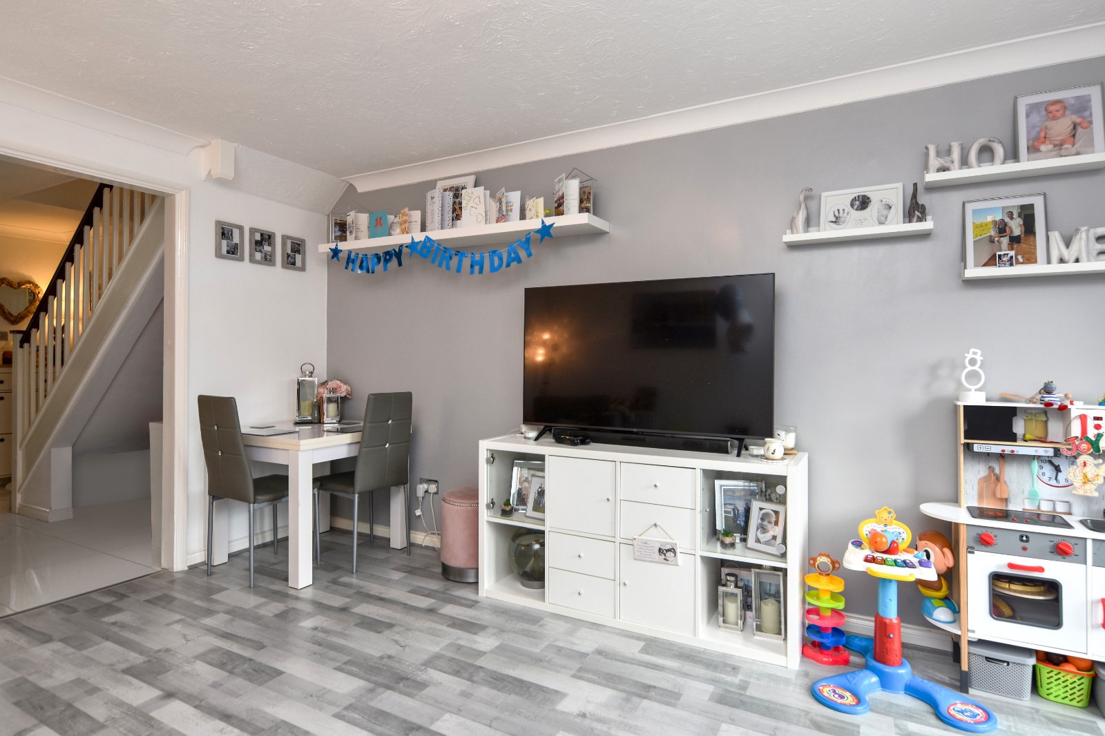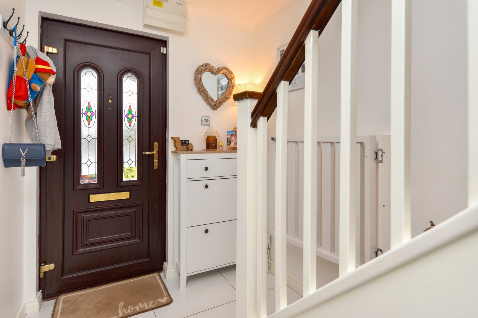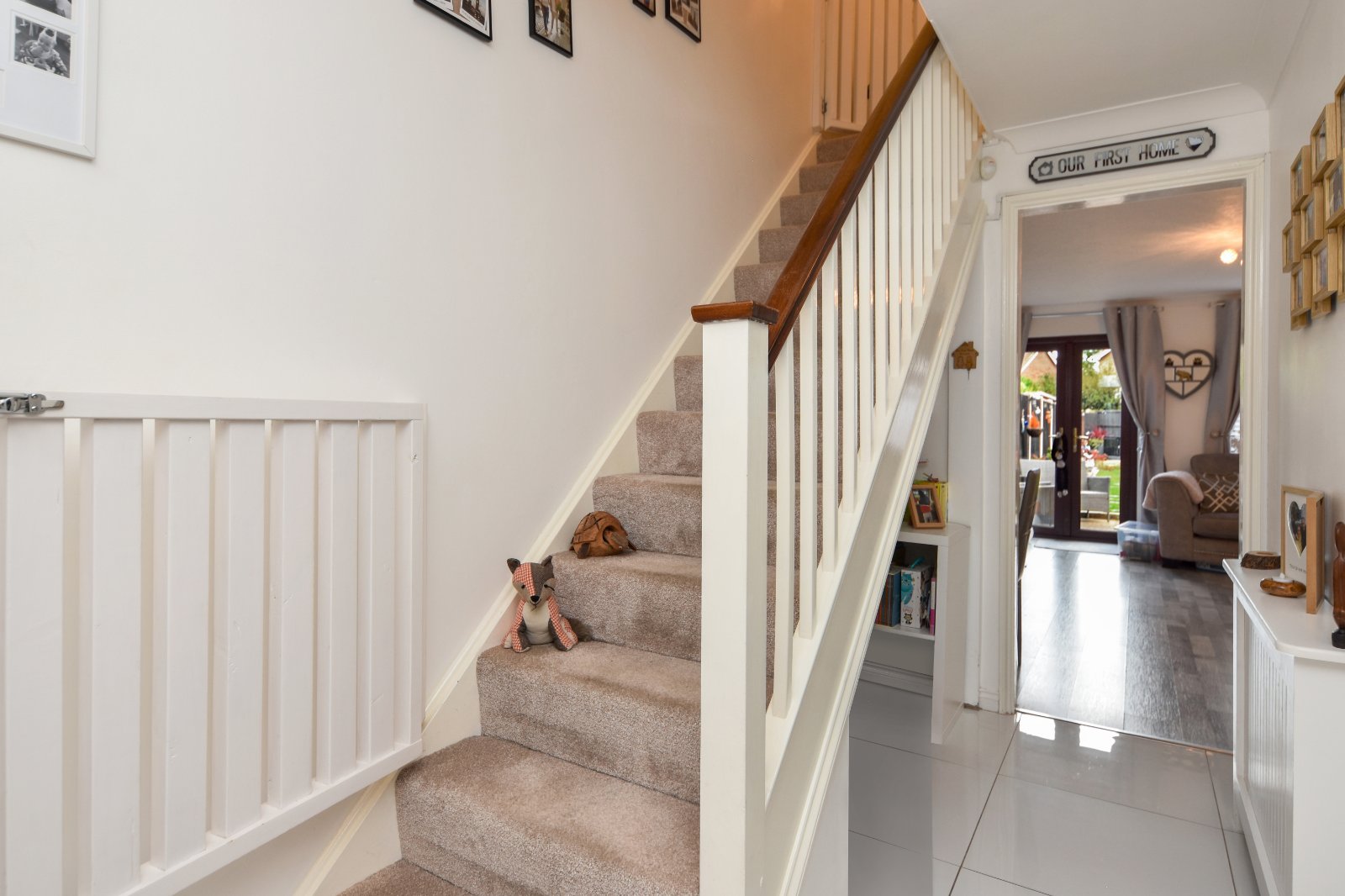 Stairs rising to first floor accommodation with spindle balustrade and storage space under. Bespoke 'made to measure' fitted stairgate. Radiator inset with decorative cabinet. Attractive high gloss ceramic tiled flooring. Coving to smooth plastered ceiling. Access to Kitchen with further made to measure door gate. Open access to;