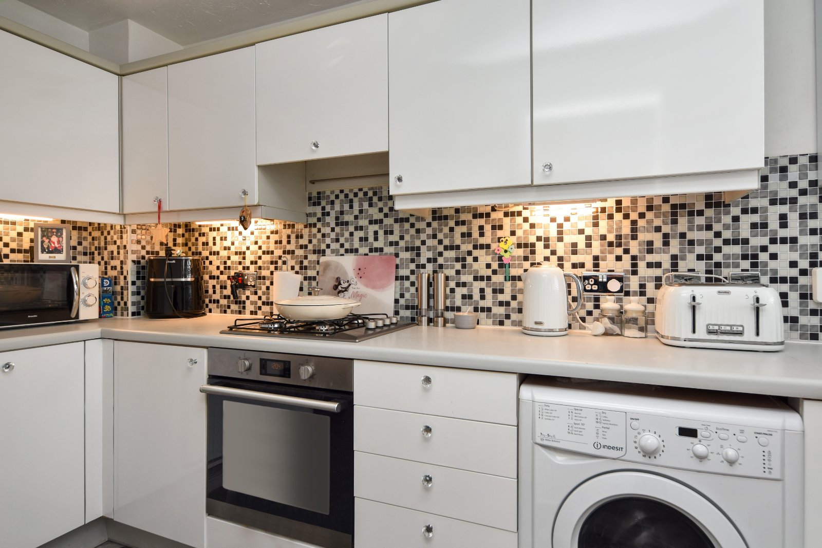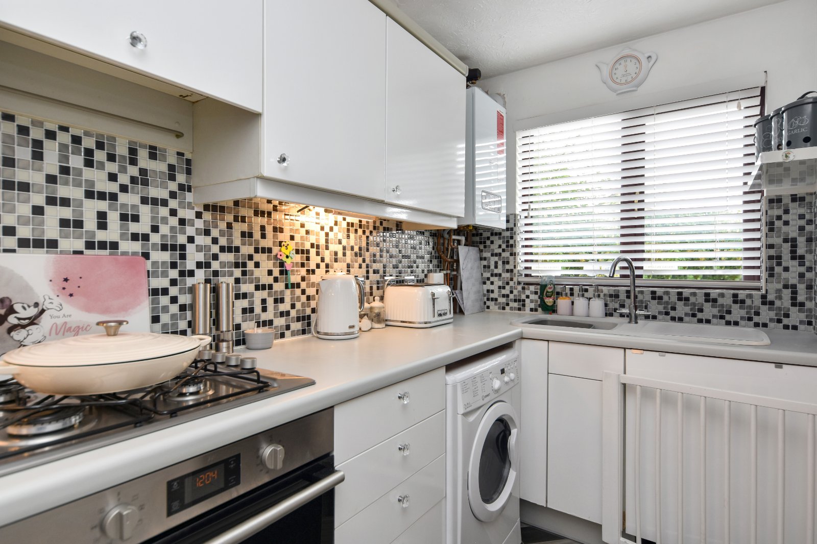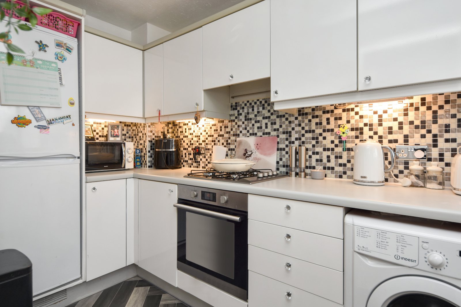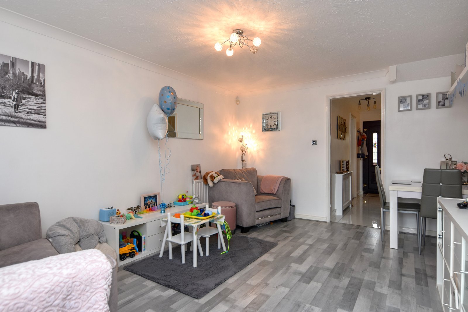 Stairs rising to first floor accommodation with spindle balustrade and storage space under. Bespoke 'made to measure' fitted stairgate. Radiator inset with decorative cabinet. Attractive high gloss ceramic tiled flooring. Coving to smooth plastered ceiling. Access to Kitchen with further made to measure door gate. Open access to;
