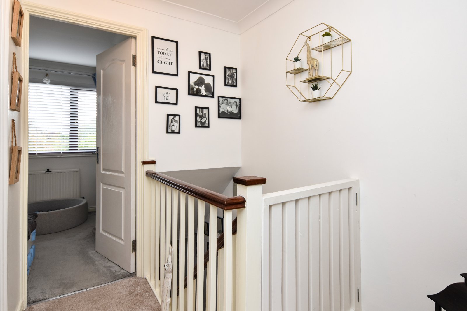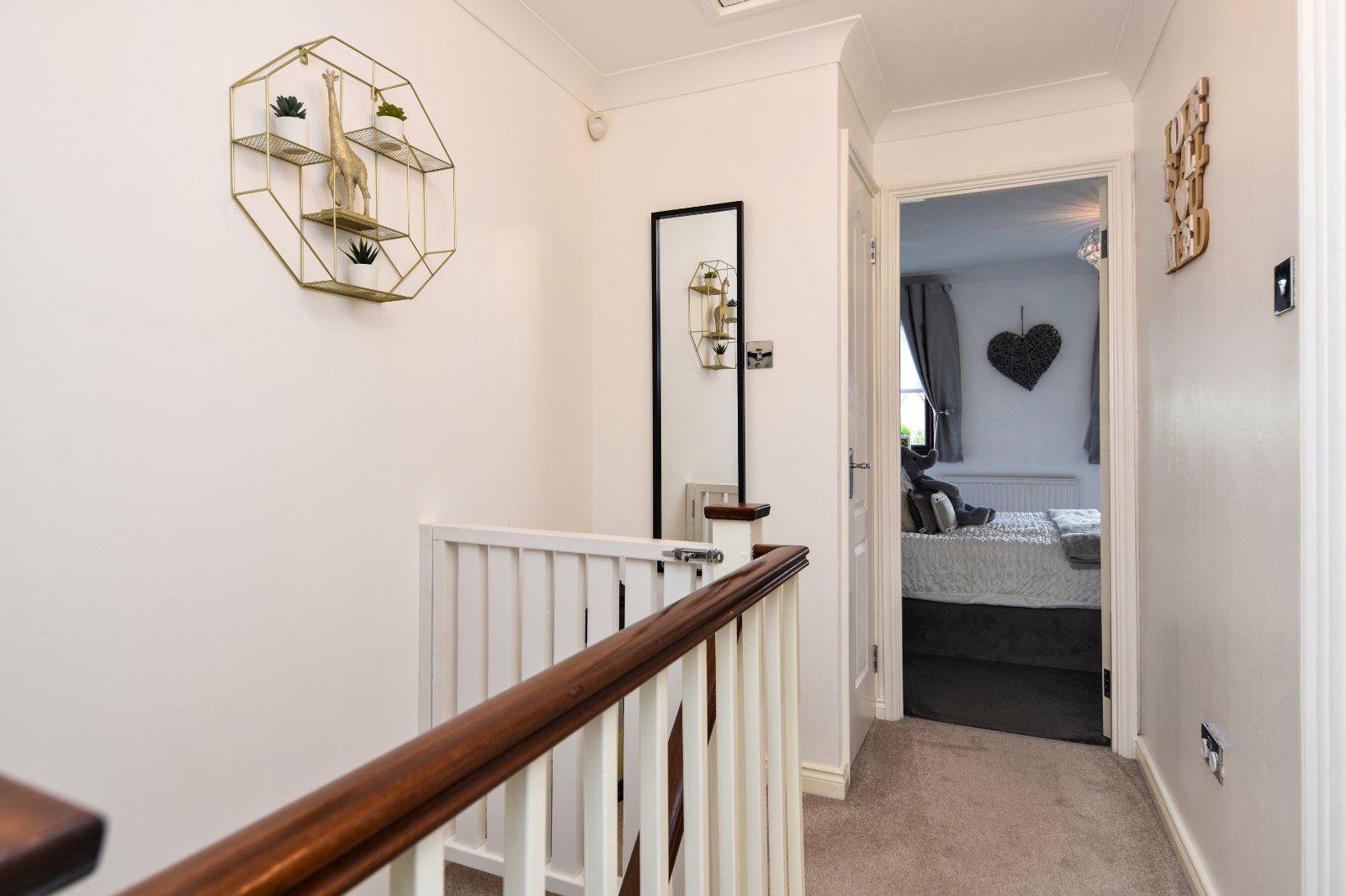 Spindle balustrade. Bespoke 'made to measure' fitted stairgate. Panelled door to good size storage cupboard with hanging space. Panelled doors to Bedrooms and Bathroom. Coving to smooth plastered ceiling with access to loft space.