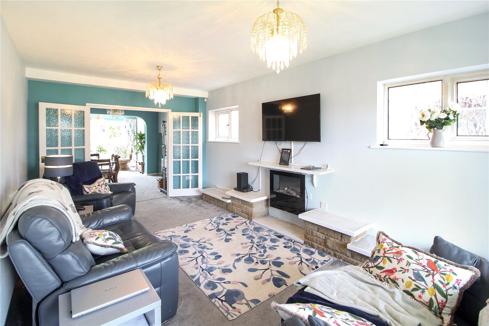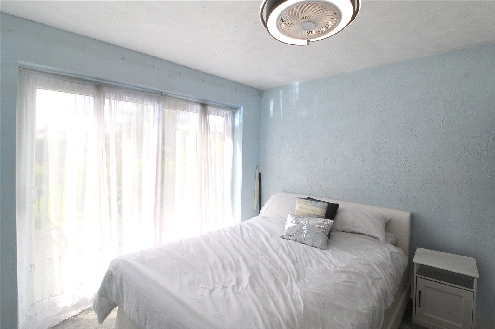 Large, bright and spacious room, with carpet to floor, smooth ceiling, ceiling light, two double glazed windows to the side aspect and double-glazed bay window to front aspect, with double doors opening onto: