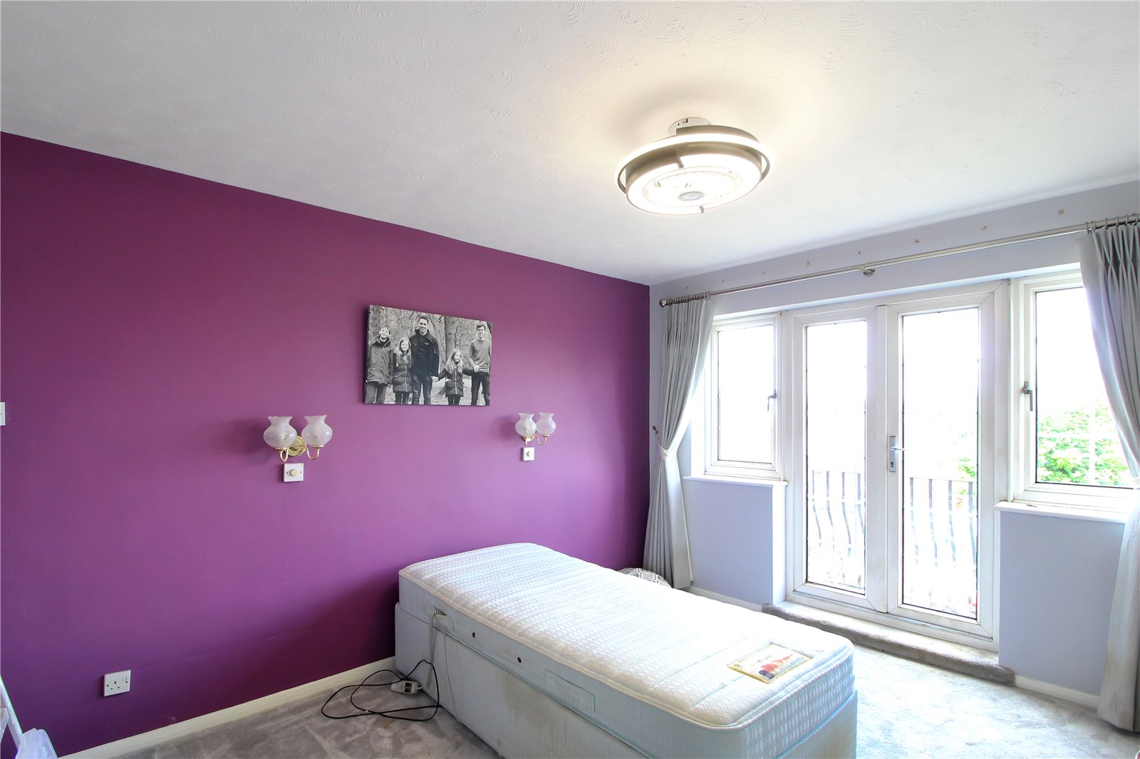 Carpet to floor, smooth ceiling, ceiling light, radiator, double glazed doors to balcony.