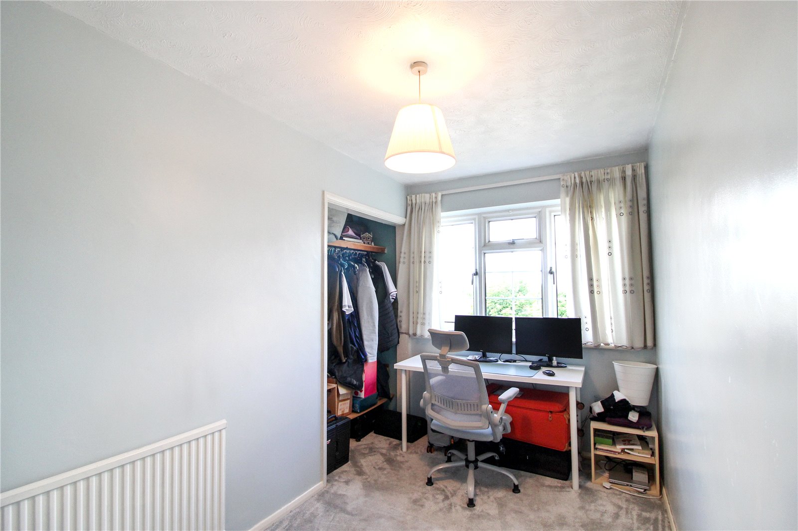 Carpet to floor, radiator. Built in storage cupboard with hanging rails and shelving, smooth ceiling, ceiling light, double glazed window to front aspect.