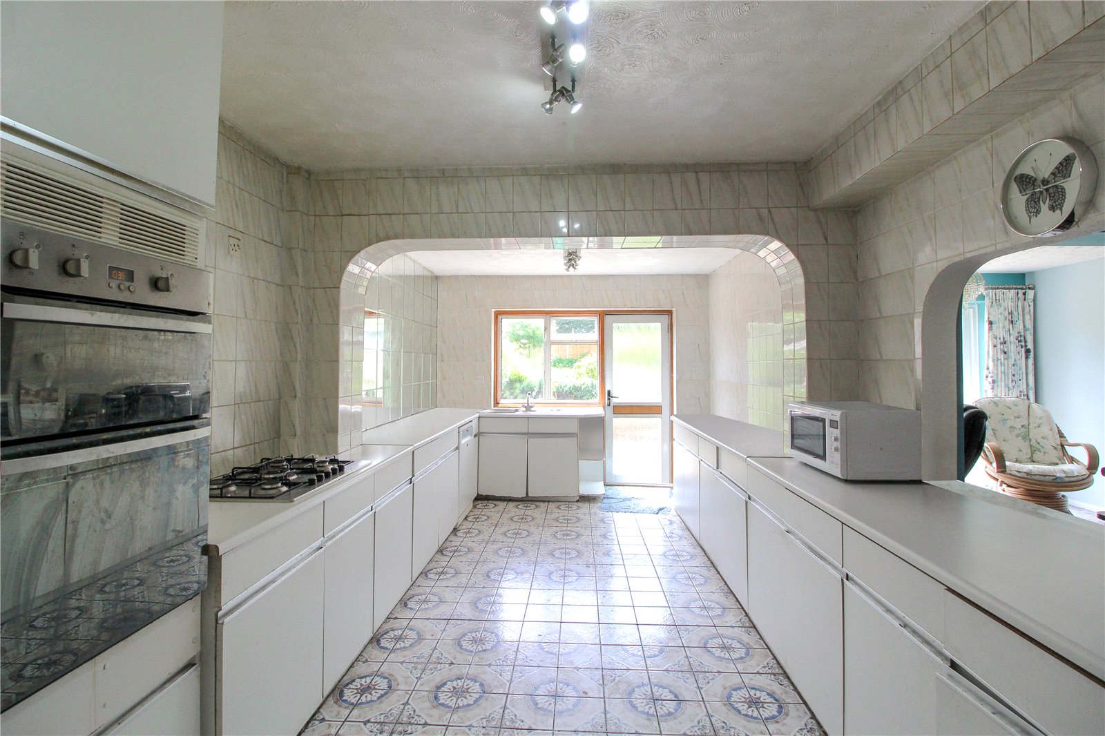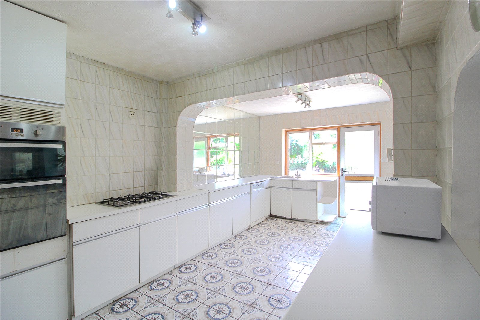 Large kitchen, fitted with eye and base level units, fitted oven and hob, sink and drainer unit, space for fridge freezer, double glazed window to side aspect double glazed door and window to rear aspect, tiled floor, two ceiling lights.