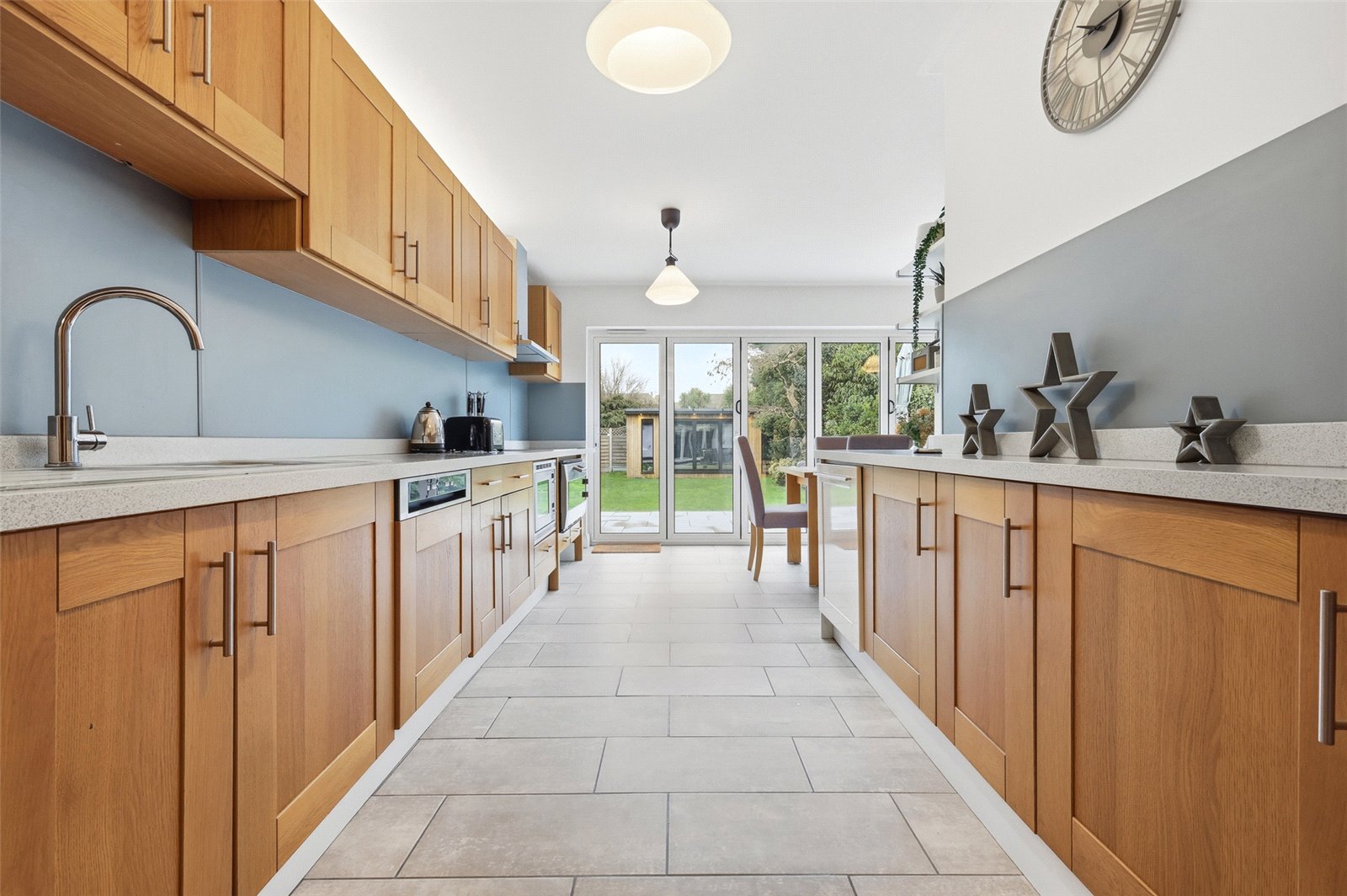 overall size. This large L shape room has wide double glazed bi folding doors leading on the rear garden. Kitchen is fitted with a range of base and eye level wooden fronted cabinets incorporating a squared edge working surface. Inset induction Range hob with designer extractor hood above. Integrated range of Gaggenau appliances including Range fan assist oven, integrated microwave oven, extractor hood, convector oven/grill, integrated dishwasher. Inset stainless steel and glass one and half bowl sink with mixer tap and drainer unit. Space for American style fridge/freezer. tiled flooring throughout. Smooth plastered ceiling. Storage cupboard to front. Door to side provides access to the: