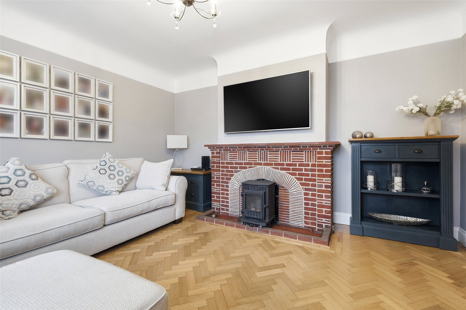 into bay. Large leaded light bay window unit to front with fitted plantation shutters. Wall mounted radiator. Original feature fireplace with brick and tiled surround, tiled half and ledge and inset gas fire. Original feature wood block Herringbone flooring. High level skirting. Feature picture rail. Coved cornice to smooth plastered ceiling.