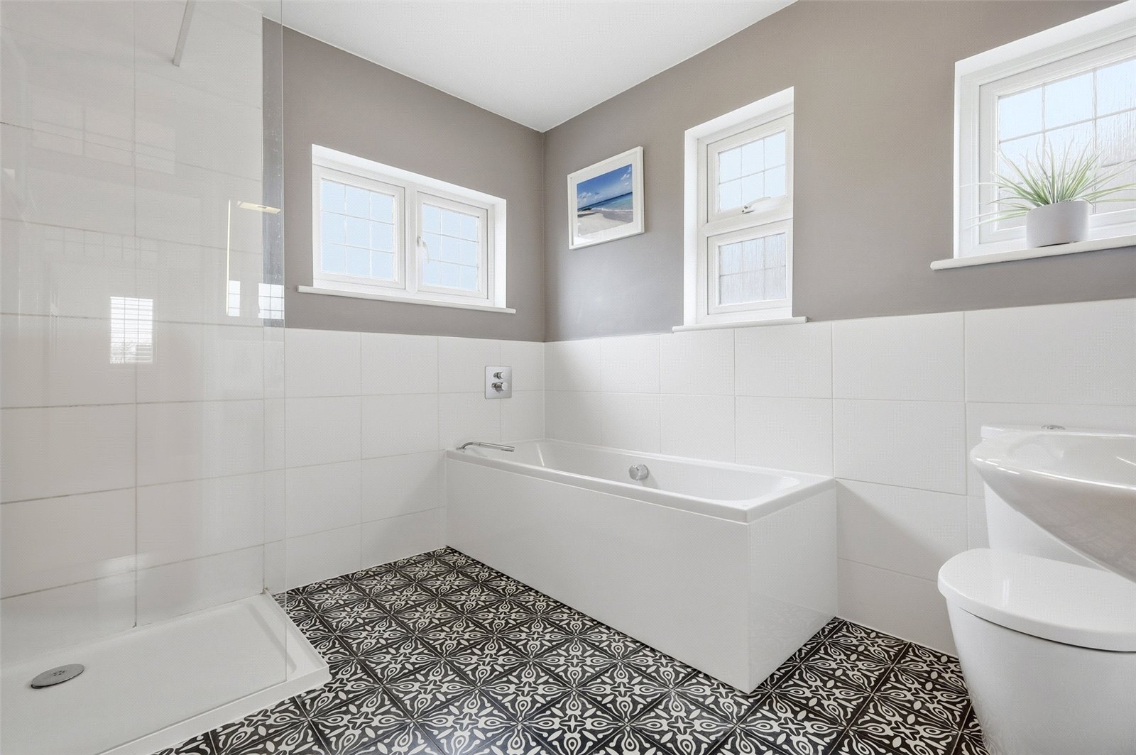 UPVC double obscured glazed windows to rear and to side. Fitted with a modern four piece comprising low flush WC, pedestal wash basin with mixer tap, panelled bath with wall mounted mixer and central bath filler and retractable shower attachment. Large walk in shower enclosure with rainfall shower head, wall mounted mixer and glass shower screen. Chrome heated towel rail. Fully tiled floors. Part tiled walls. Smooth plastered ceiling with ceiling mounted extractor fan. Under floor heating.