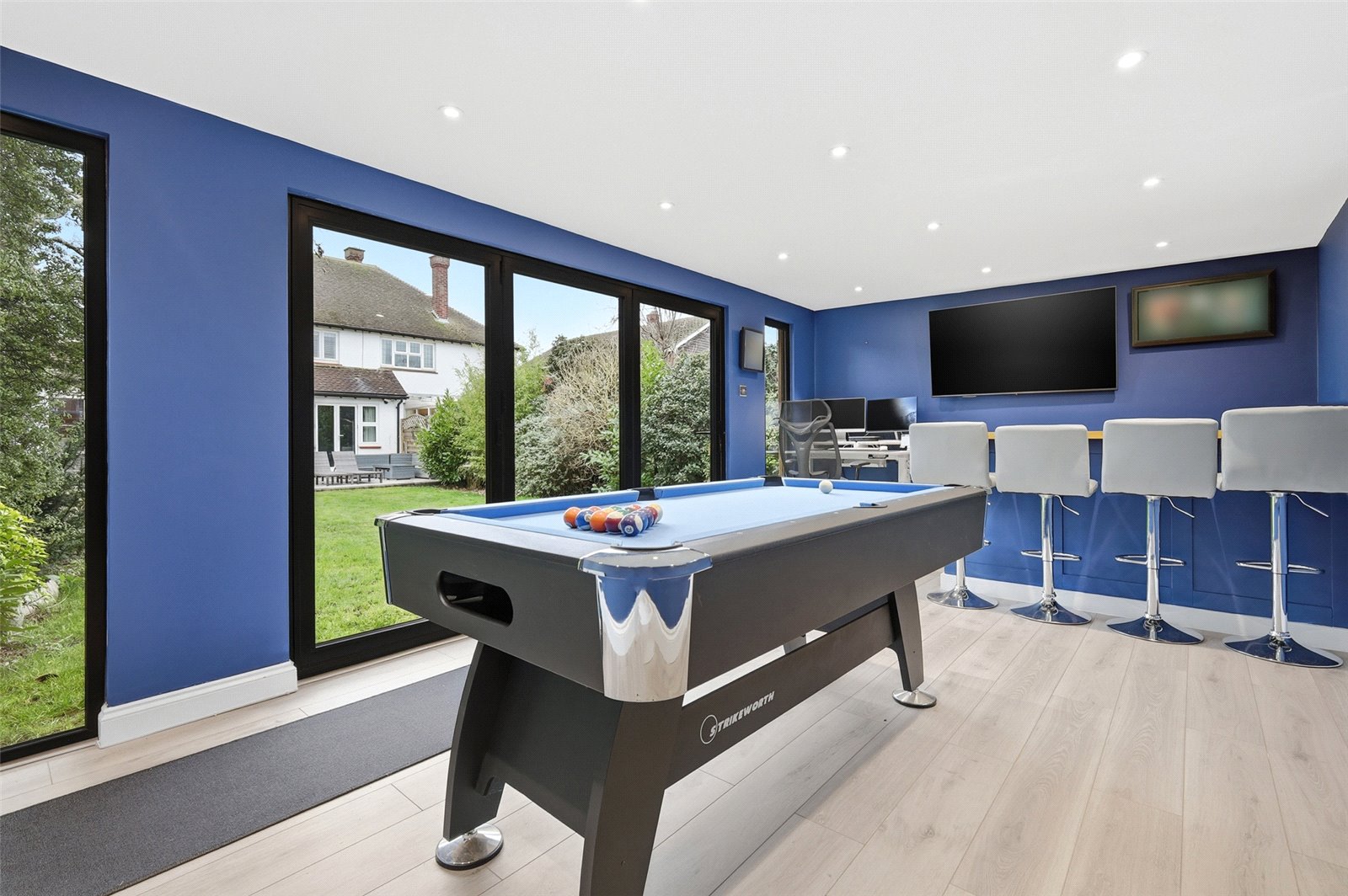 Large double glazed bi folding doors to front. Further double glazed windows to front and rear. Fitted bar area with space for wine cooler, storage shelving beside. Wall mounted electric heater. Wood effect laminate flooring. High level skirting. Smooth plastered ceiling with recessed LED lighting.