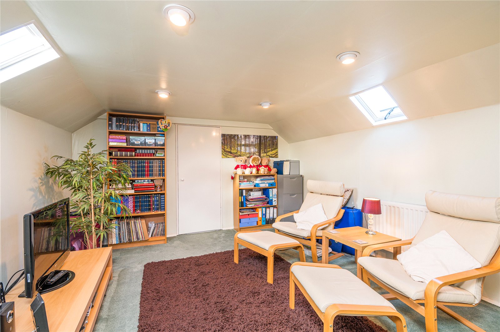 Two double glazed Velux windows, one to front, one to rear. Wall mounted radiator. Access to large walk in cupboard with shelving. Plus, easy access to the ample fully boarded eaves storage space. Smooth plastered ceiling with recessed lighting.