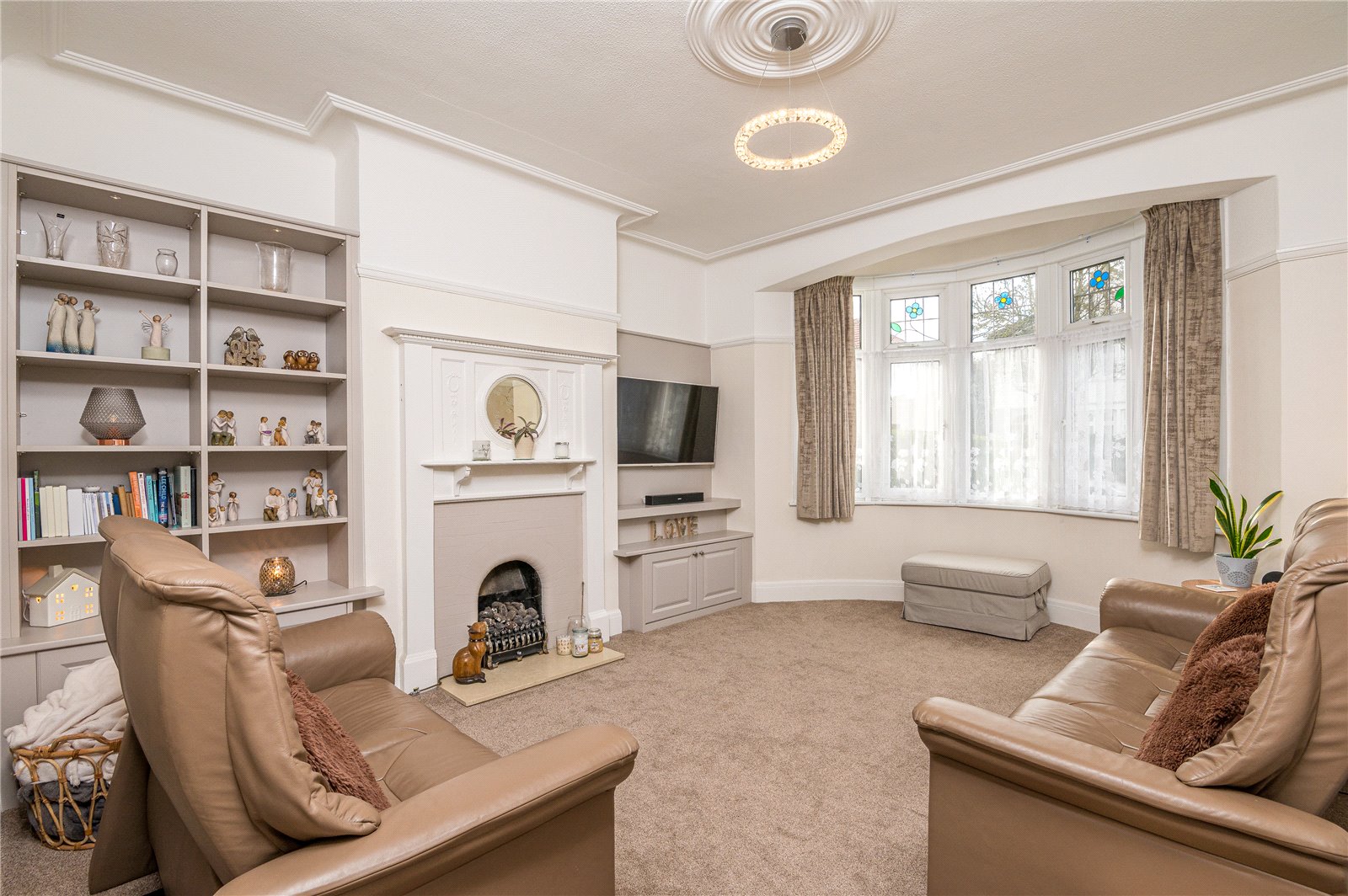 into bay. Large UPVC double glazed bay window unit to front with leaded light fan windows above. Wall mounted radiator. Original feature fireplace with wooden mantle, brick surround, inset gas fire and stone hearth. Fitted cabinetry with display shelving and storage cupboards. High level skirting. Feature picture rail. Ornate plasterwork to ceiling with feature ceiling rose.