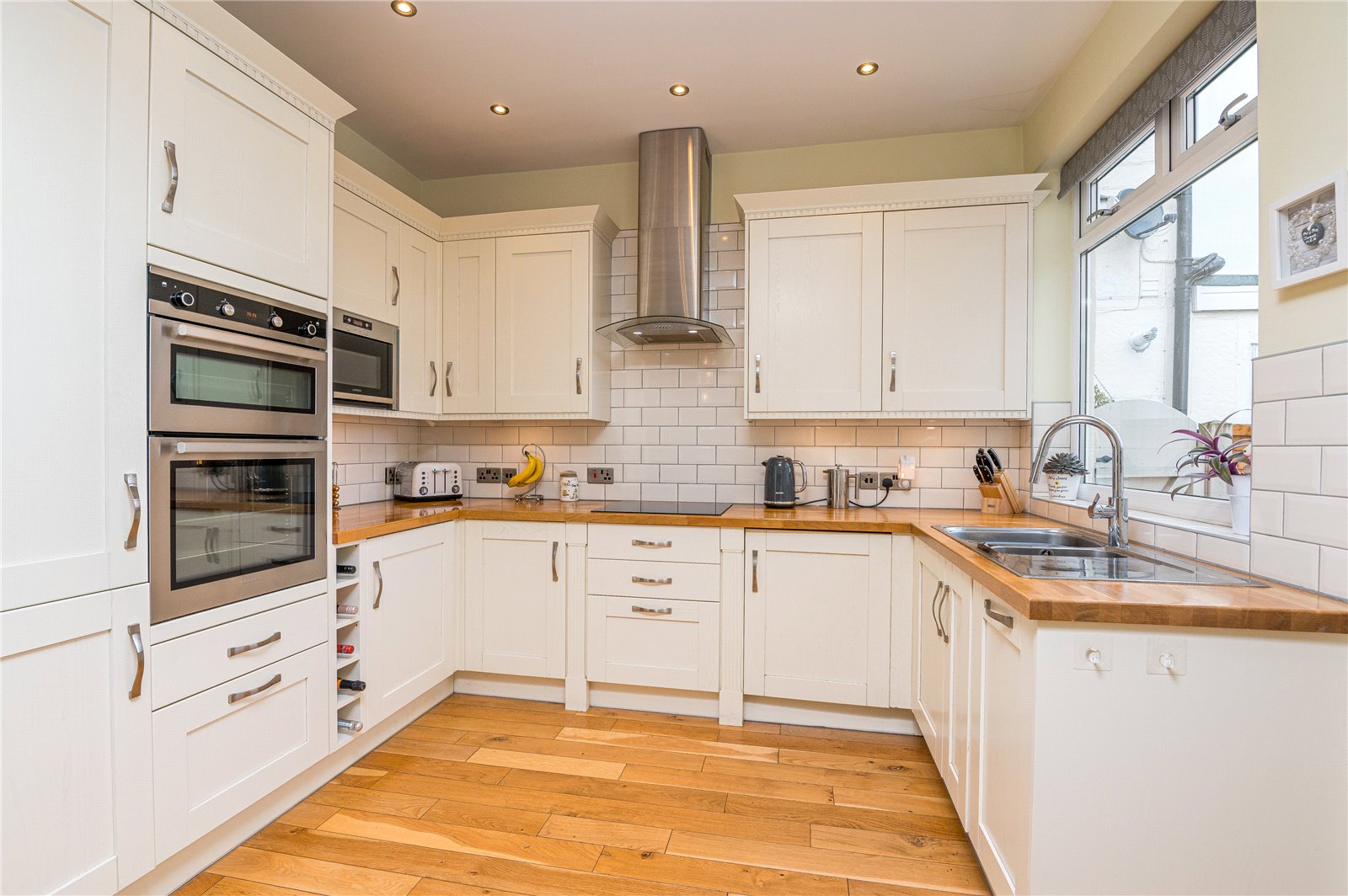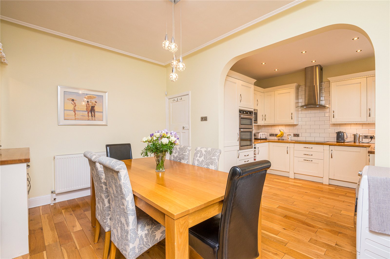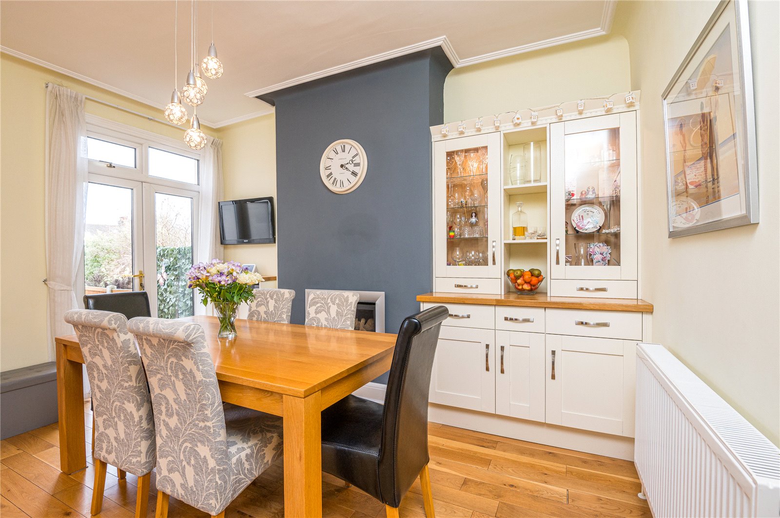 UPVC double glazed French doors to rear leading on to rear garden. Large UPVC double glazed window to rear. Kitchen is fitted with a range of base and eye level shaker style cabinets incorporating a rolled edge wooden working surface, inset stainless steel sink with mixer tap and drainer unit. Inset four burner Neff induction hob with canopied extractor hood above. Inset one and half electric fan assist oven. Integrated slim line dishwasher and washing machine. Integrated fridge/freezer and microwave. Fully tiled splash backs. Further fitted base and eye level display cabinet with rolled edge working surface to dining area. Wall mounted radiator. Feature gas fire. Engineered Oak flooring throughout. High level skirting. Ornate plasterwork to smooth plastered ceiling with recessed LED lighting. Doorway to rear provides access to the: