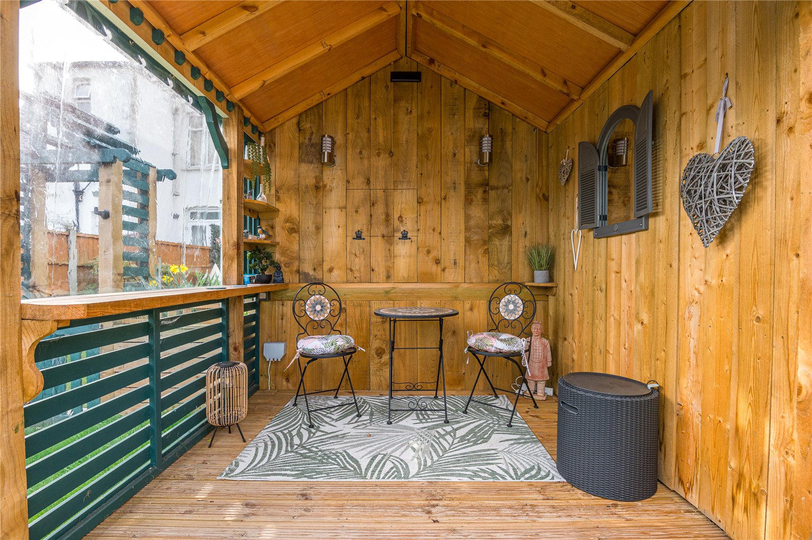 A good size workshop to rear with power and lighting. Large bay window to side. Access hatch to rear pergola. Separate bike store. Large covered pergola behind with bar area to side.