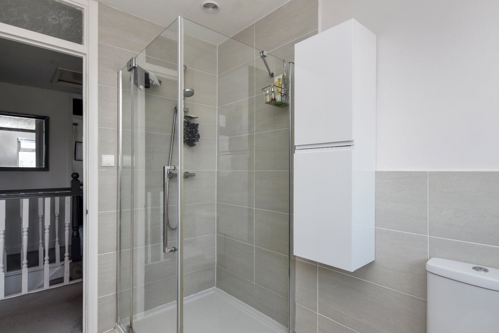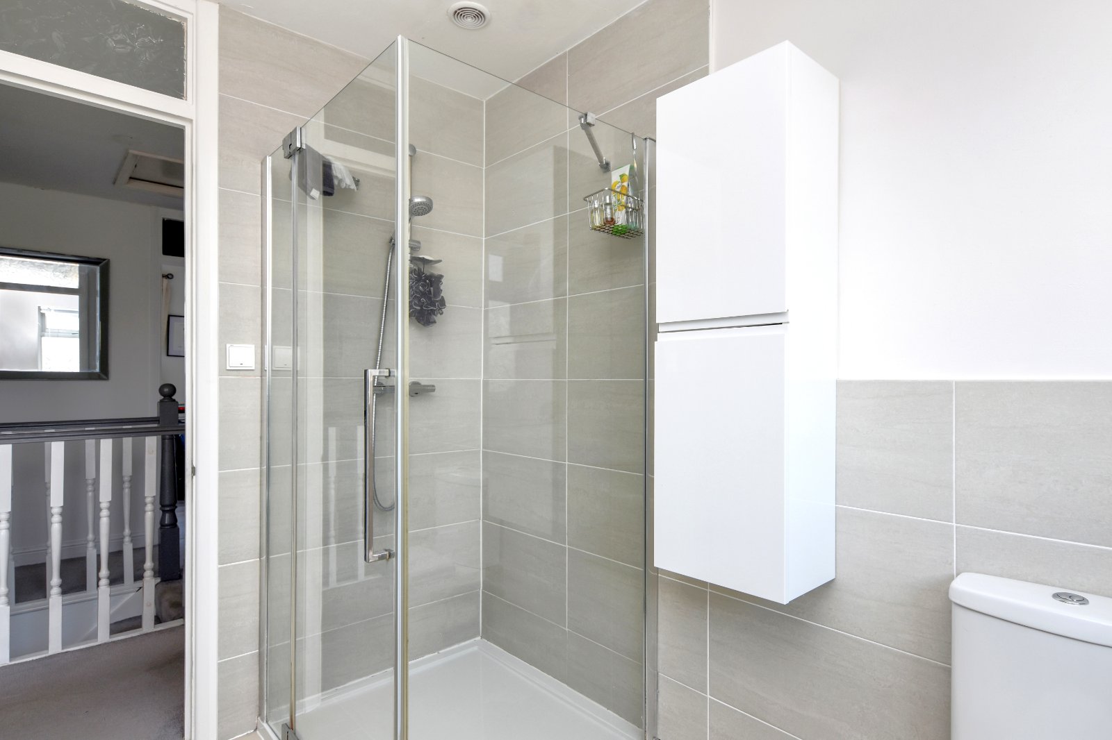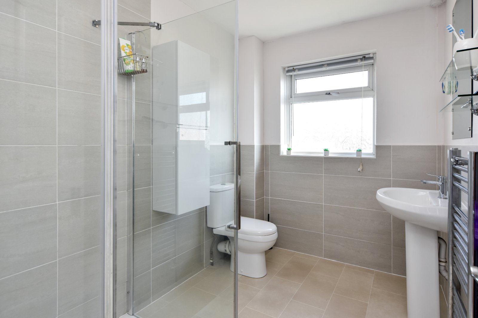 Obscure uPVC double glazed window to front aspect. Ladder style heated towel rail. Partly tiled walls. Tile effect linoleum flooring. The modern white suite comprises independent tiled shower enclosure with integrated shower units, dual flush low level wc and pedestal wash hand basin with mixer tap over. Wall mounted high gloss fronted bathroom cabinet (to remain). Smooth plastered ceiling inset with extractor fan.