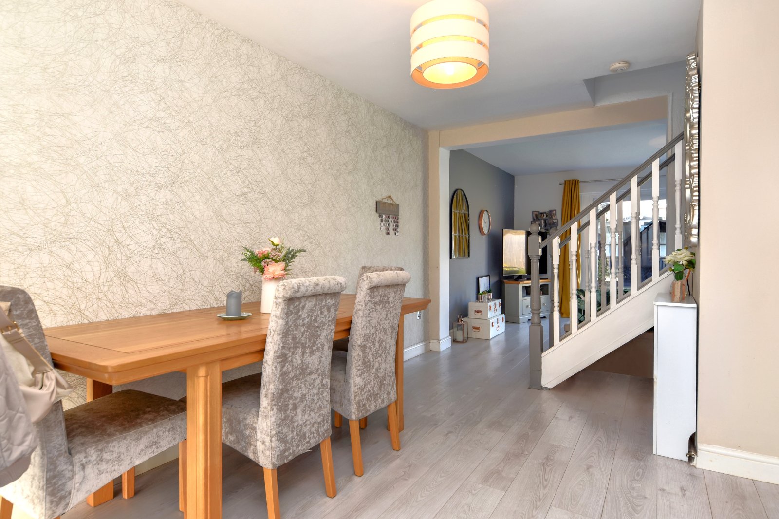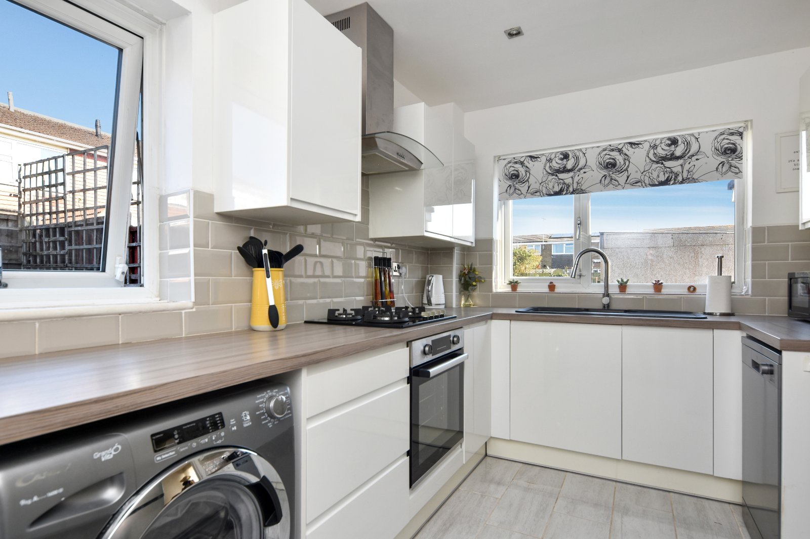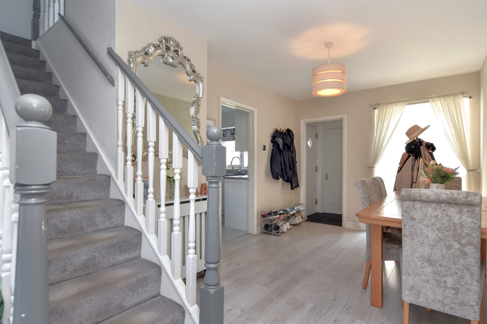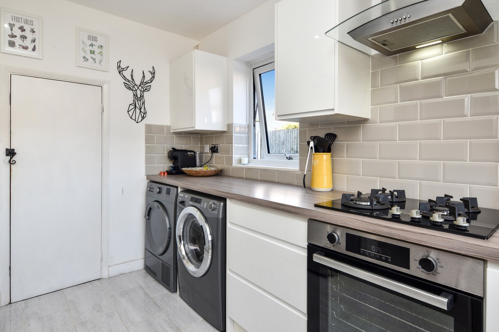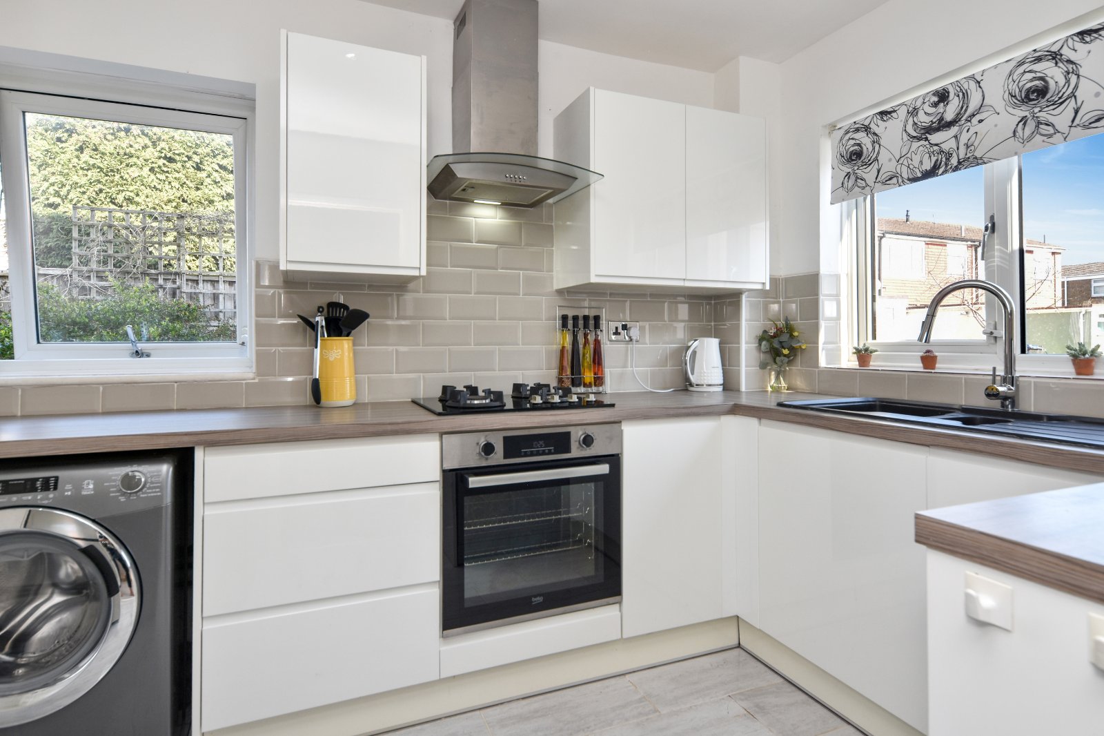 uPVC double glazed windows to front and side aspect. The modern fitted kitchen is fitted with a range of eye and base level high gloss fronted cabinetry with square edge wood effect working surfaces over inset with black single drainer one-and-a-half sink unit with 'pull out' mixer tap over. Built in 'Beko' electric oven with four ring gas hob over with wall mounted stainless steel extractor canopy over. Attractive metro-style tiling splashbacks. Ample under space appliances spaces. Further space for upright fridge freezer. High gloss tiled flooring. Door to spacious understairs storage cupboard with wall mounted 'Worcester' boiler (The agent has been advised that this was installed in 2019). Smooth plastered ceiling inset with recessed lighting.