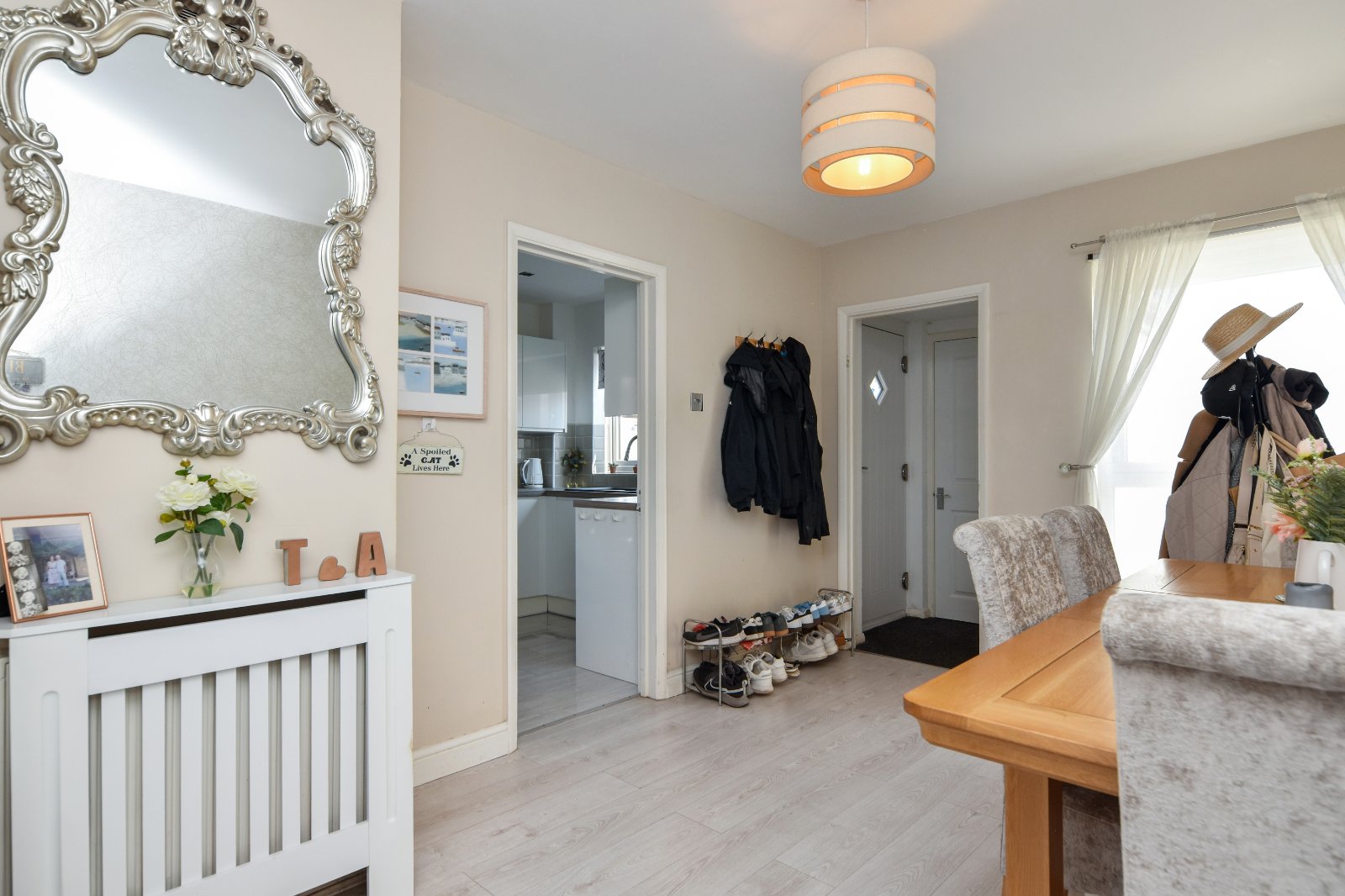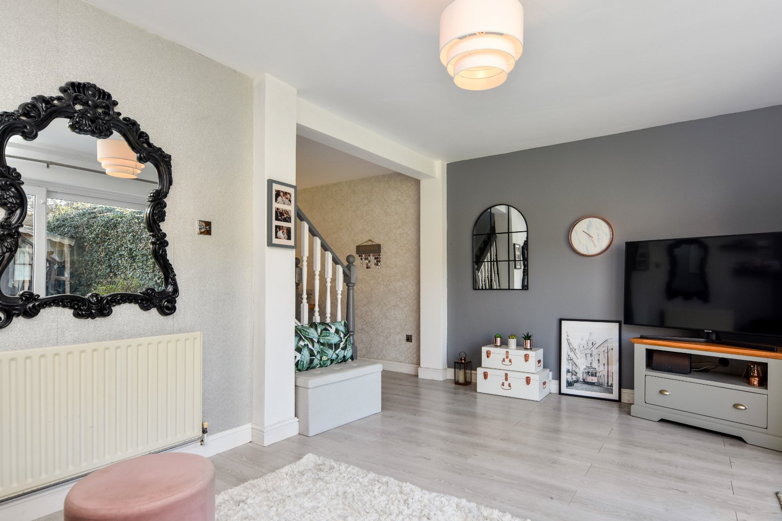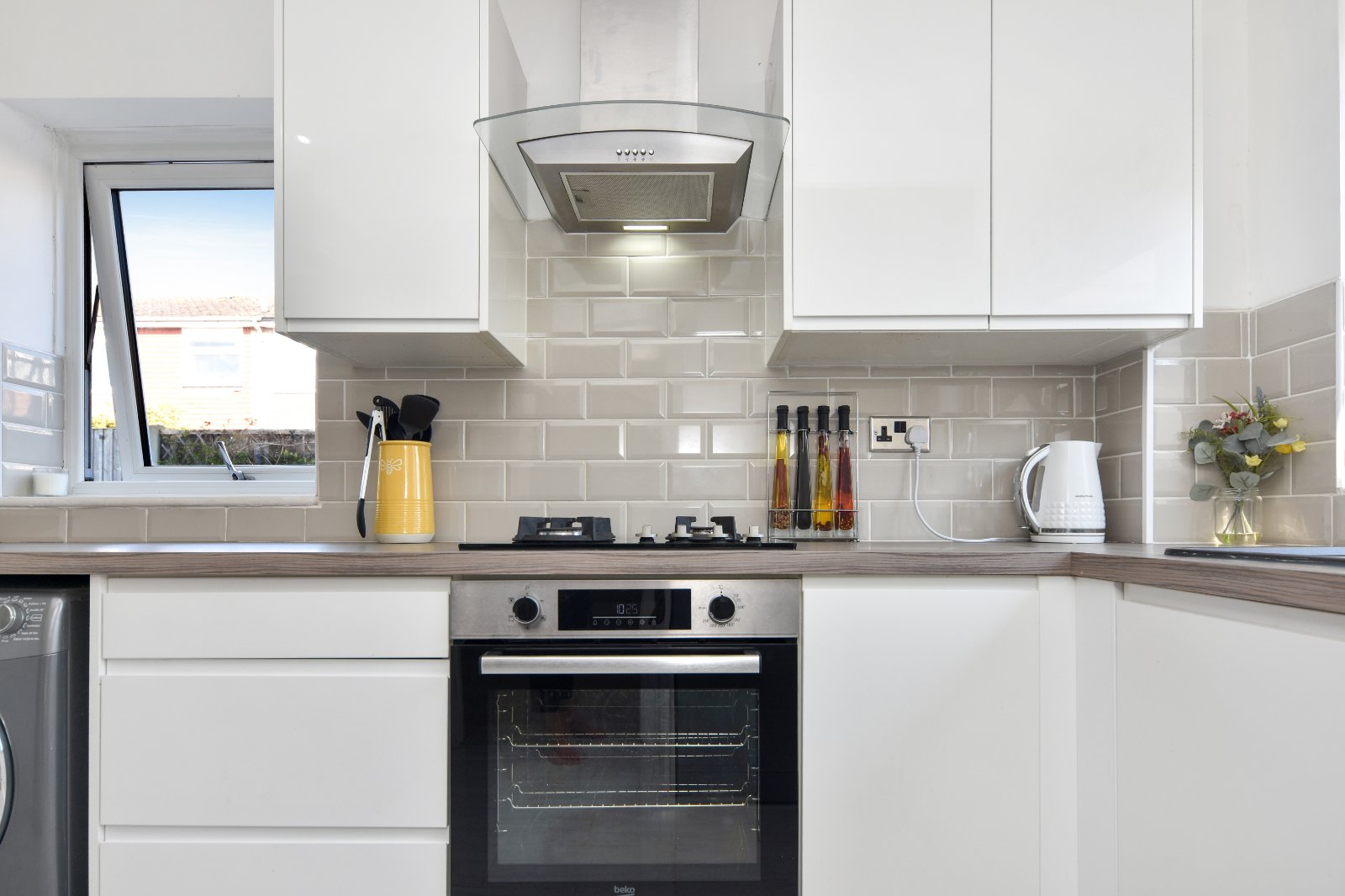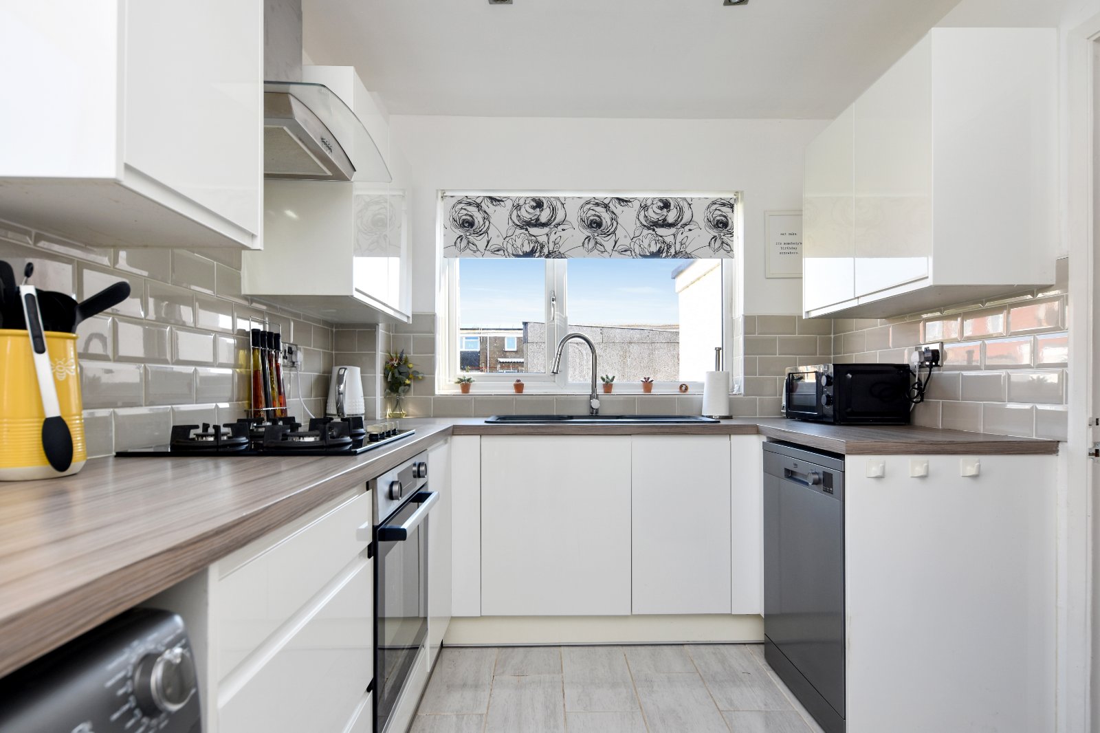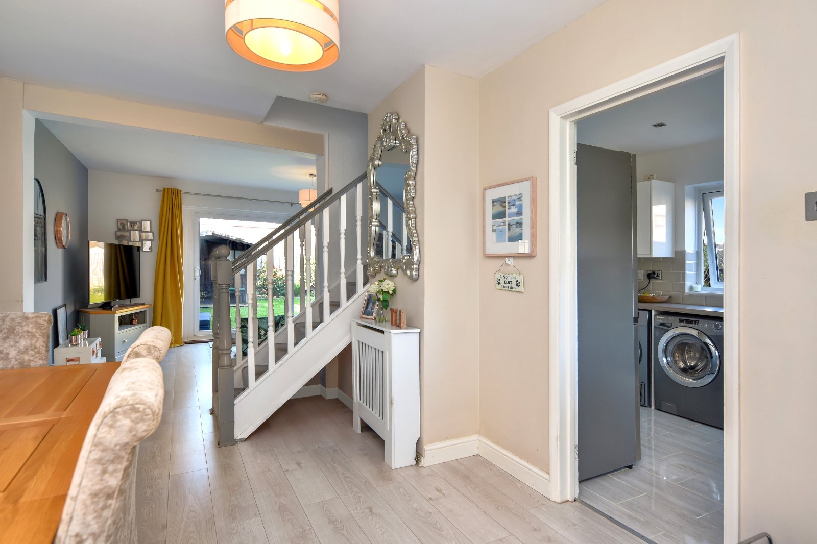 uPVC double glazed windows to front and side aspect. The modern fitted kitchen is fitted with a range of eye and base level high gloss fronted cabinetry with square edge wood effect working surfaces over inset with black single drainer one-and-a-half sink unit with 'pull out' mixer tap over. Built in 'Beko' electric oven with four ring gas hob over with wall mounted stainless steel extractor canopy over. Attractive metro-style tiling splashbacks. Ample under space appliances spaces. Further space for upright fridge freezer. High gloss tiled flooring. Door to spacious understairs storage cupboard with wall mounted 'Worcester' boiler (The agent has been advised that this was installed in 2019). Smooth plastered ceiling inset with recessed lighting.