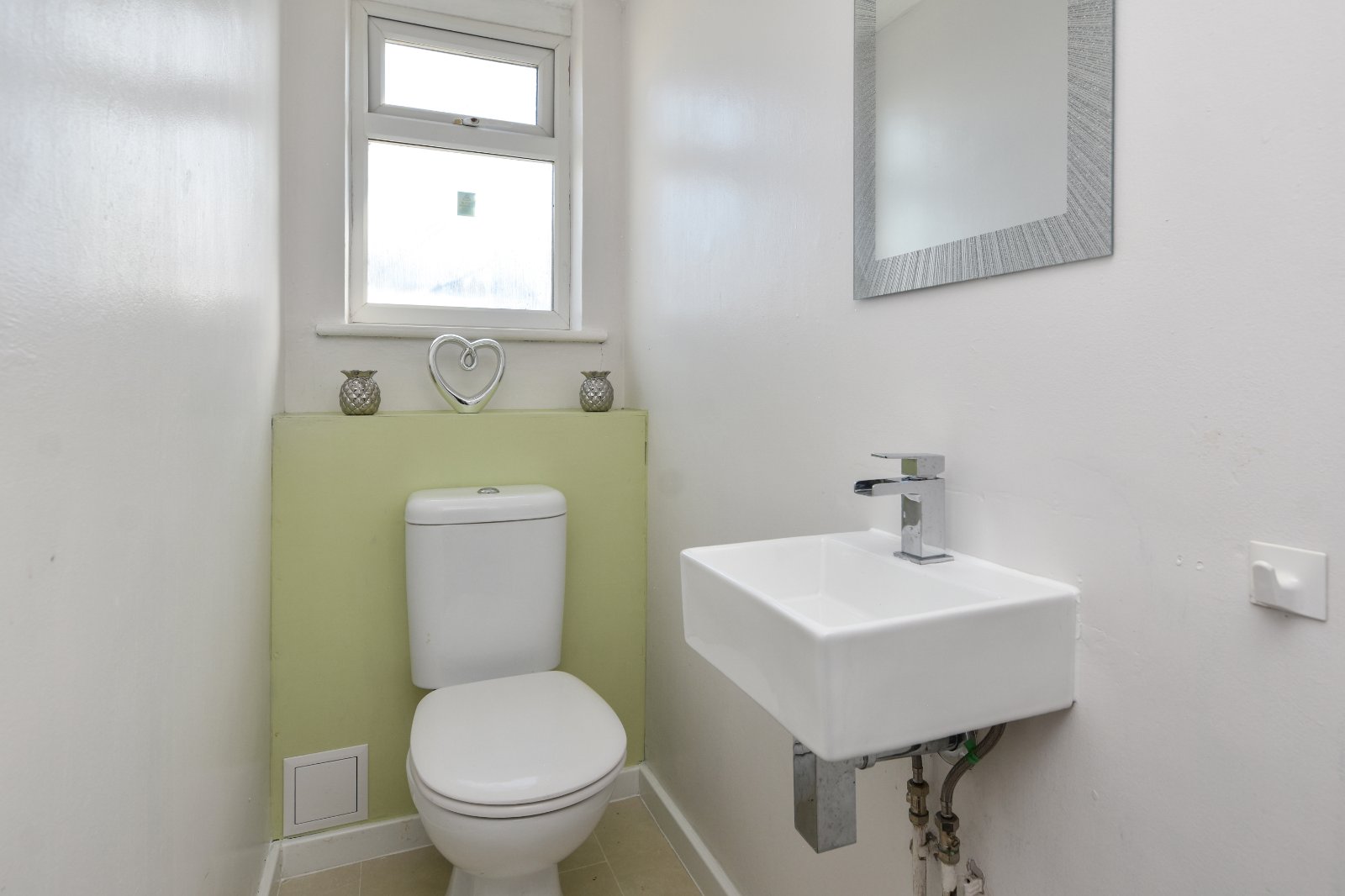 Obscure uPVC double glazed window to front aspect. The modern white suite comprises a suspended wash hand basin with mixer tap over and dual flush low level wc. Tile effect linoleum flooring. Textured ceiling.